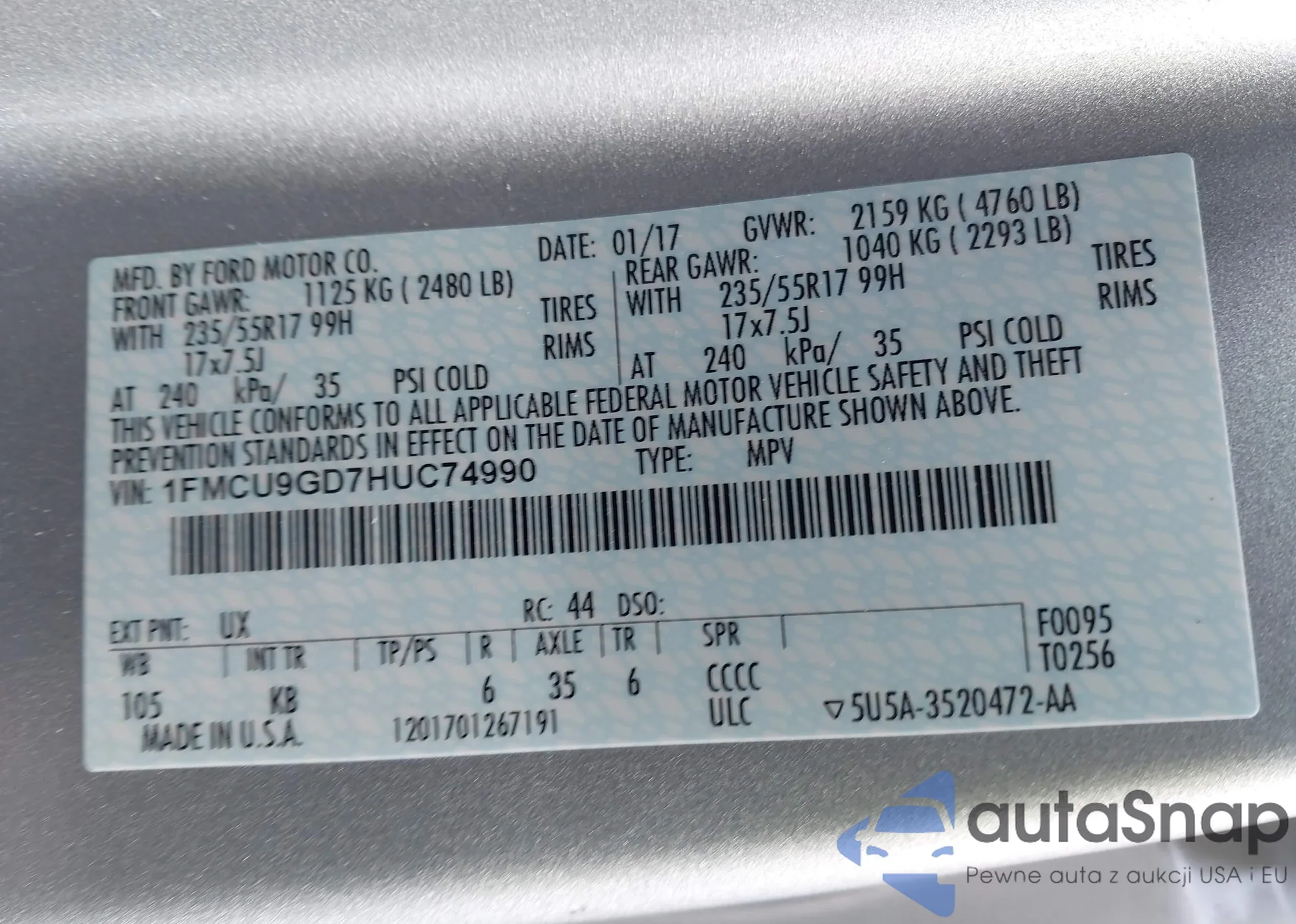 • VIN: 1FMCU9GD7HUC74990