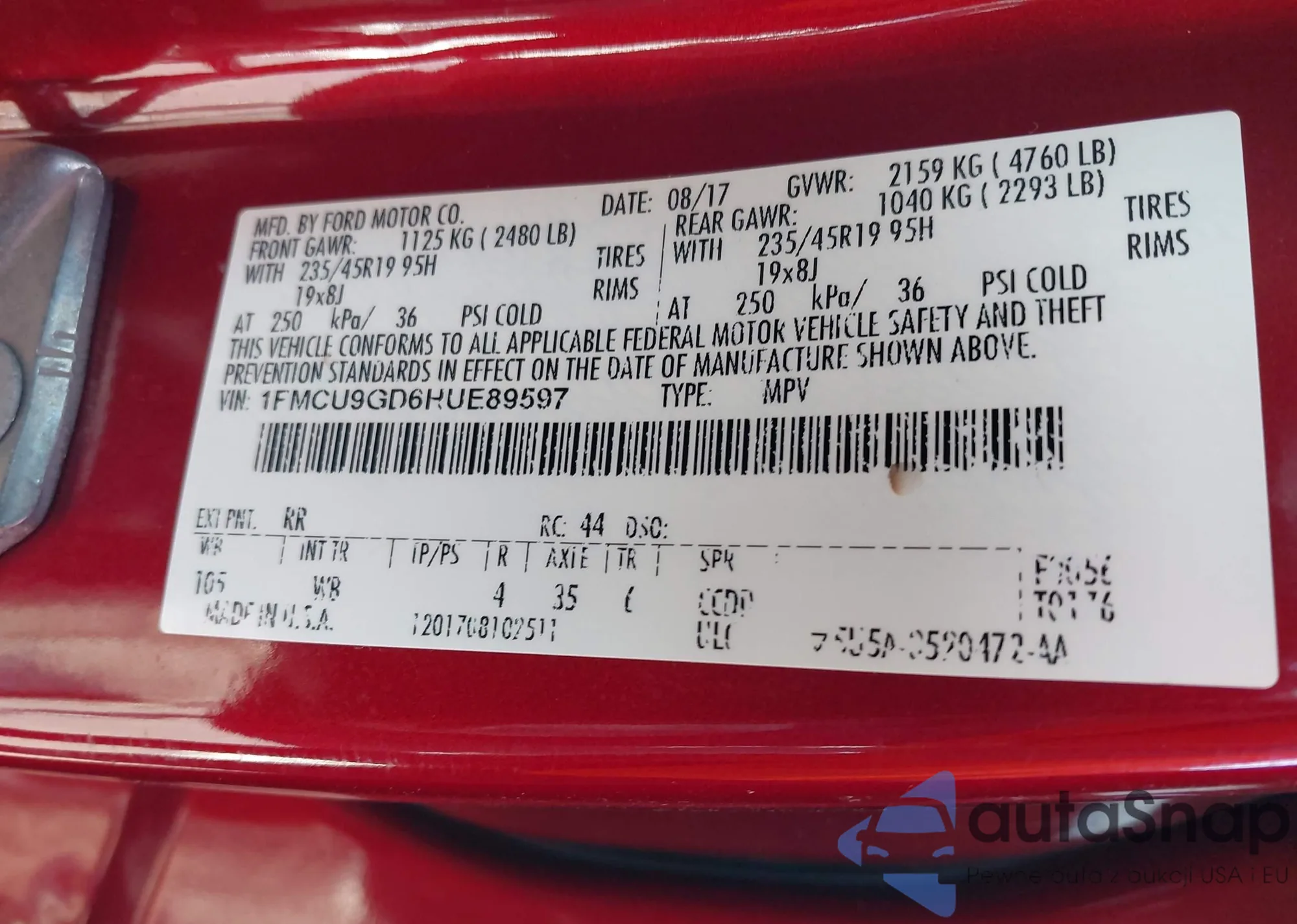 • VIN: 1FMCU9GD6HUE89597