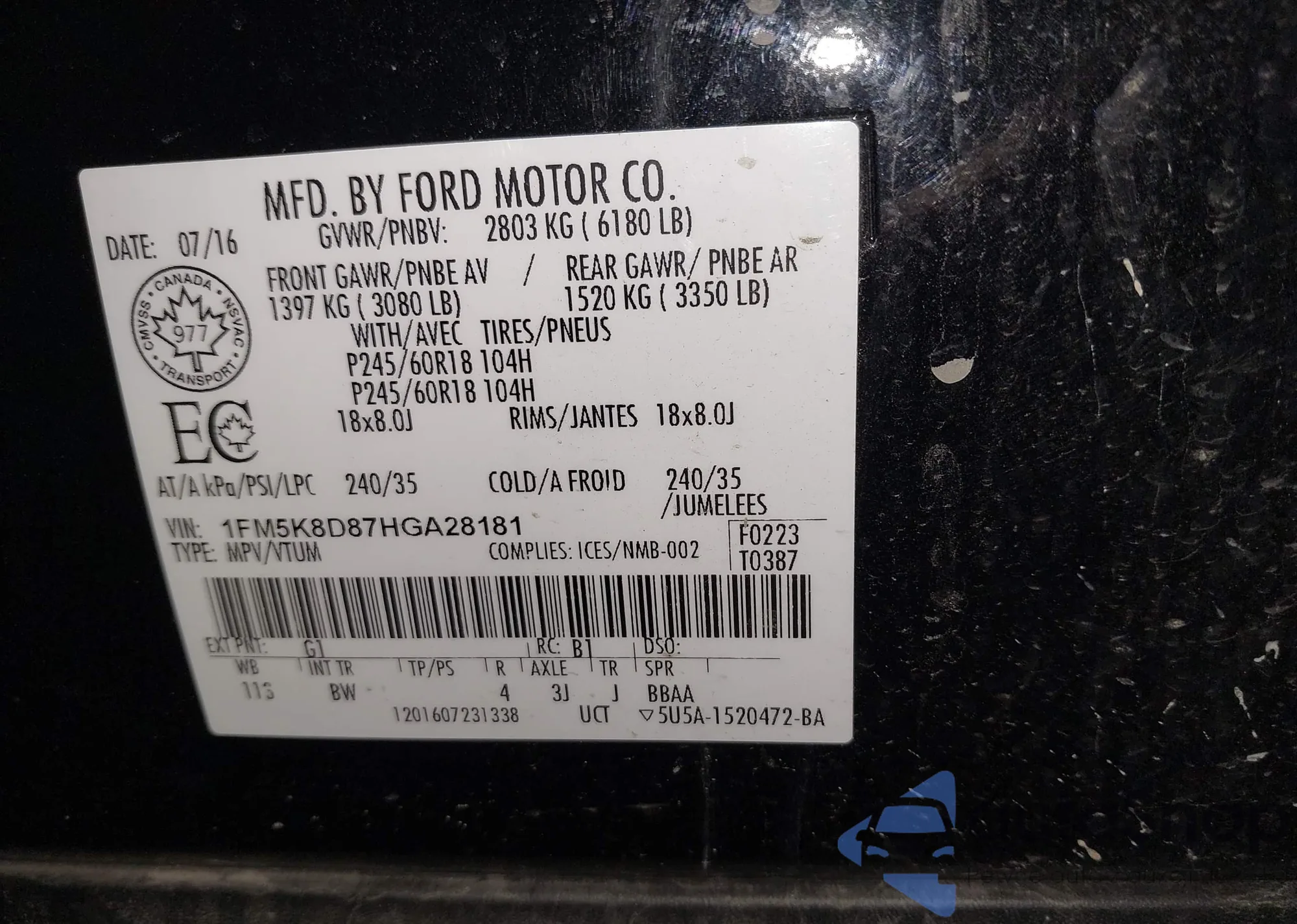 • VIN: 1FM5K8D87HGA28181