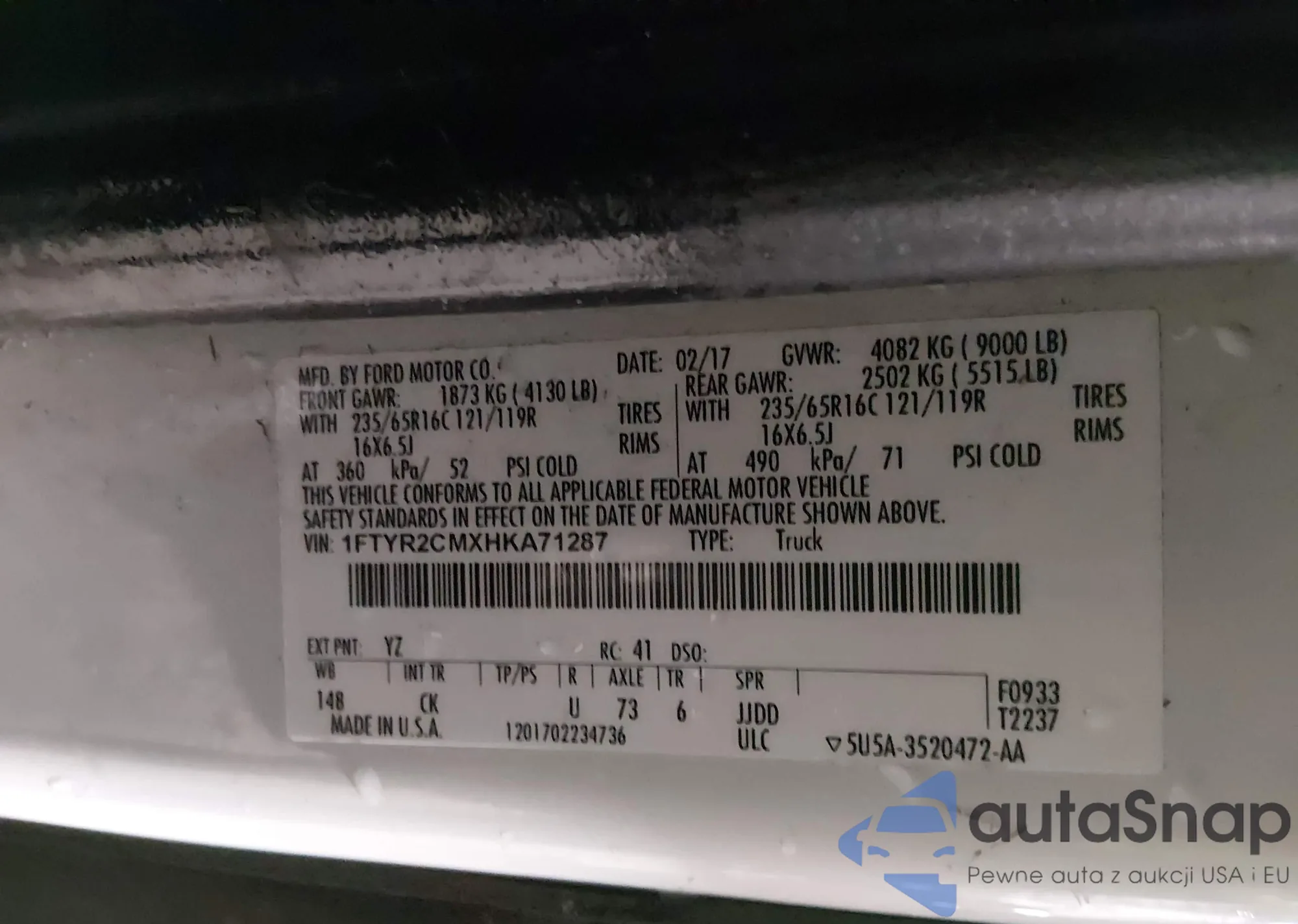 Samochód Ford Transit 2017 (VIN 1FTYR2CMXHKA71287) nie był wcześniej licytowany. Dokumenty są czyste, przebieg odpowiada lub jest niższy niż średnia rynku. Sprzedaje go firma ubezpieczeniowa – polecamy zakup. Dostawa do portu zajmie ok. 6–8 tygodni.