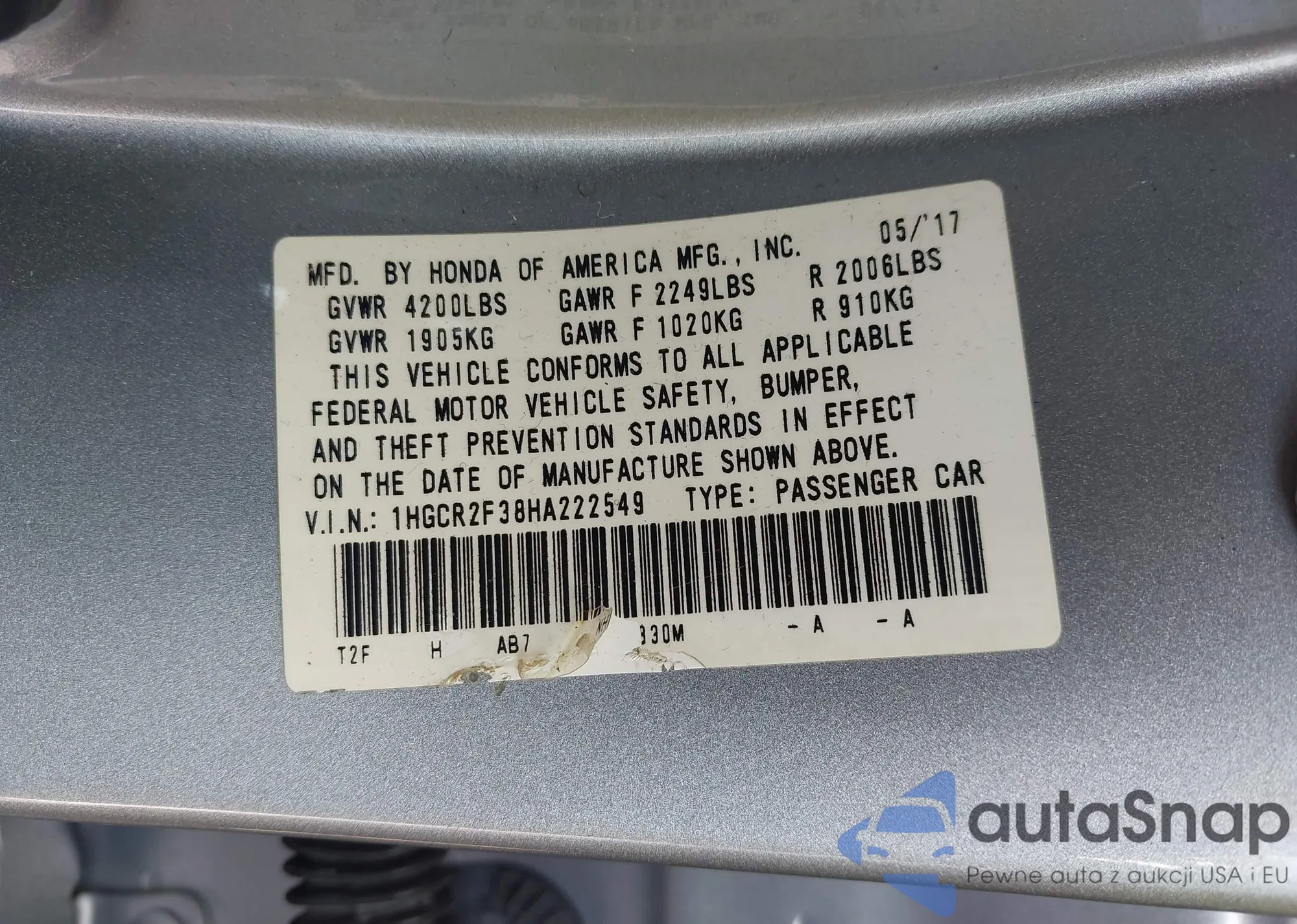 • VIN: 1HGCR2F38HA222549