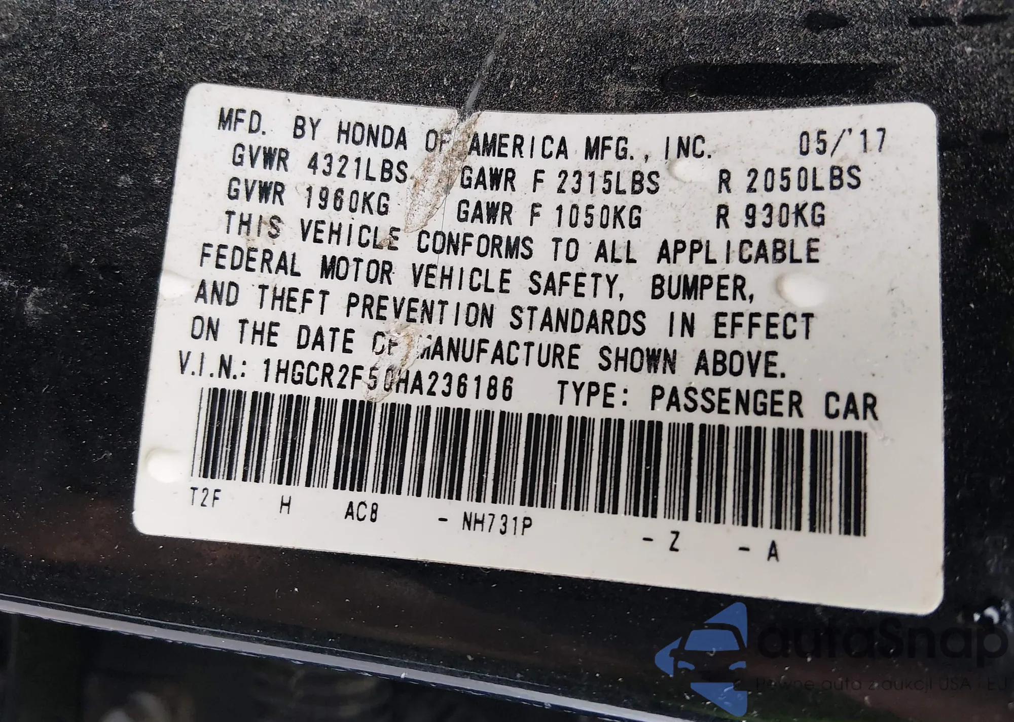 VIN: 1HGCR2F50HA236186