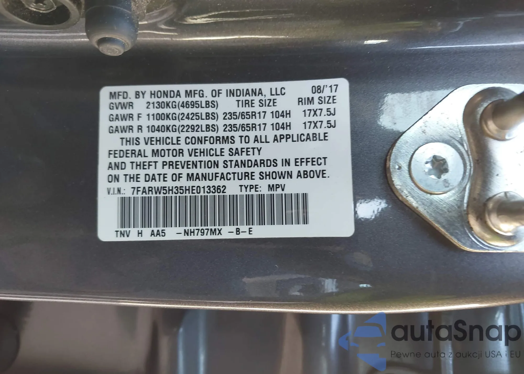 Samochód Honda CR-V 2017 (VIN 7FARW5H35HE013362) nie był wcześniej licytowany. Dokumenty są czyste, przebieg odpowiada lub jest niższy niż średnia rynku. Sprzedaje go firma ubezpieczeniowa – polecamy zakup. Dostawa do portu zajmie ok. 6–8 tygodni.