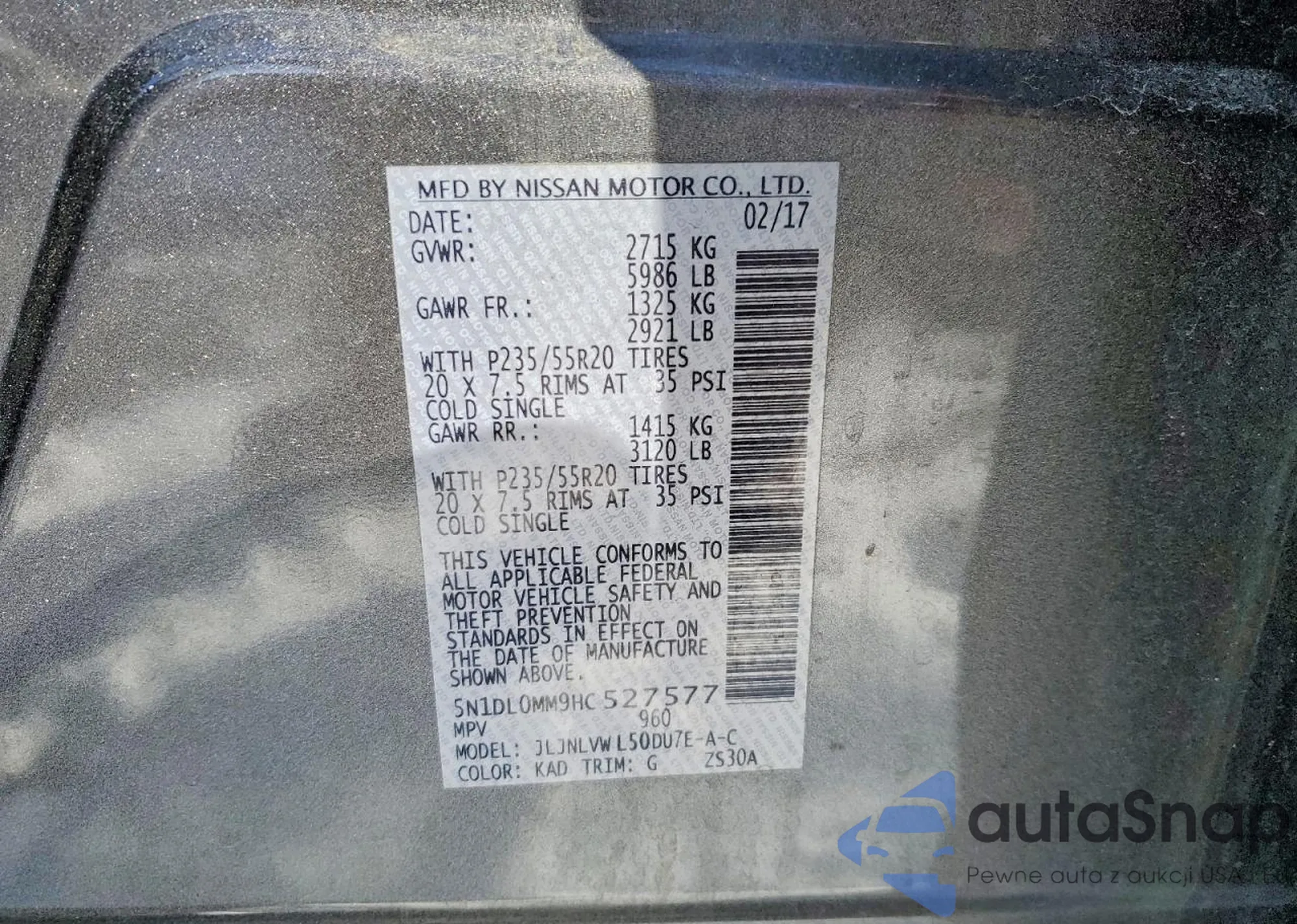 VIN: 5N1DL0MM9HC527577