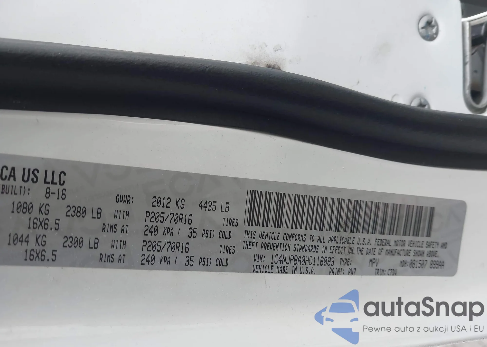Samochód Jeep Liberty (Patriot) 2017 (VIN 1C4NJPBA0HD116093) ma dokumenty uniemożliwiające rejestrację. Mogą pojawić się trudności przy eksporcie i rejestracji. Skontaktuj się z ekspertami AutaSnap w celu znalezienia alternatywy.