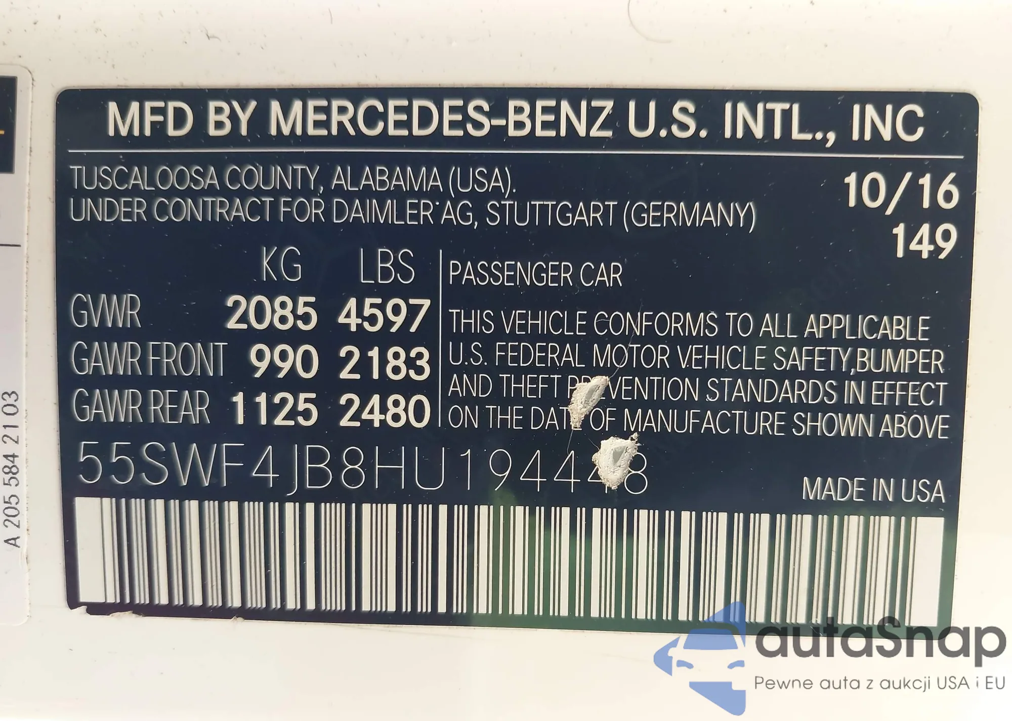 Samochód Mercedes-Benz C-klasse 2017 (VIN 55SWF4JB8HU194448) nie był wcześniej licytowany. Dokumenty są czyste, przebieg odpowiada lub jest niższy niż średnia rynku. Sprzedaje go firma ubezpieczeniowa – polecamy zakup. Dostawa do portu zajmie ok. 6–8 tygodni.