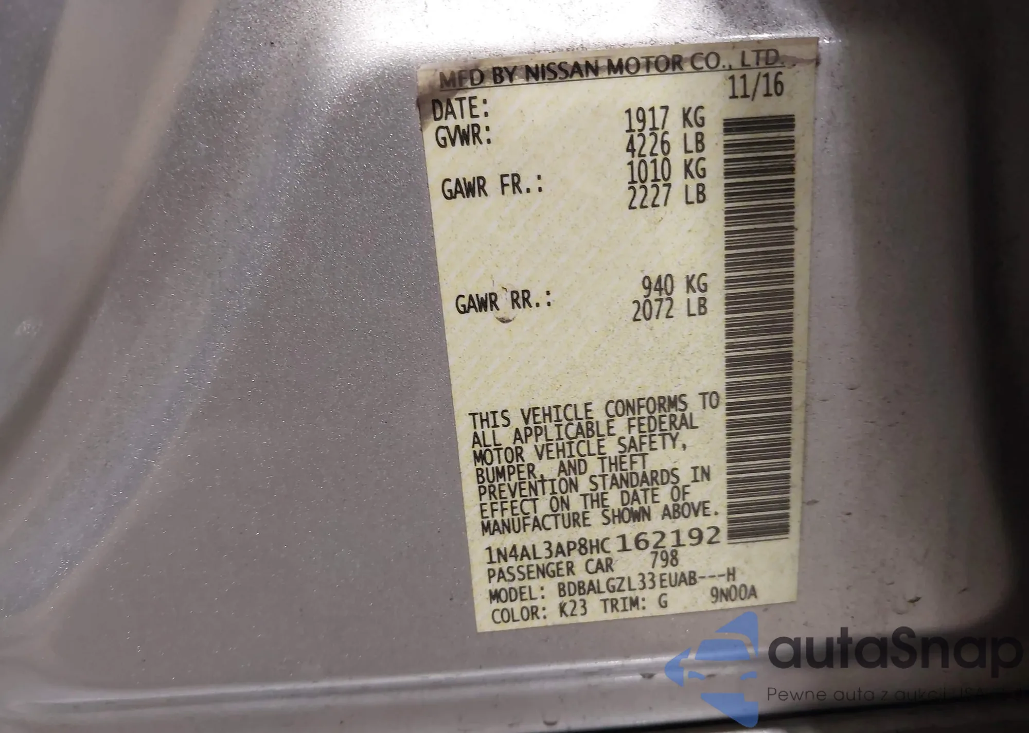 Samochód Nissan Altima 2017 (VIN 1N4AL3AP8HC162192) nie był wcześniej licytowany. Dokumenty są czyste, przebieg odpowiada lub jest niższy niż średnia rynku. Sprzedaje go firma ubezpieczeniowa – polecamy zakup. Dostawa do portu zajmie ok. 6–8 tygodni.
