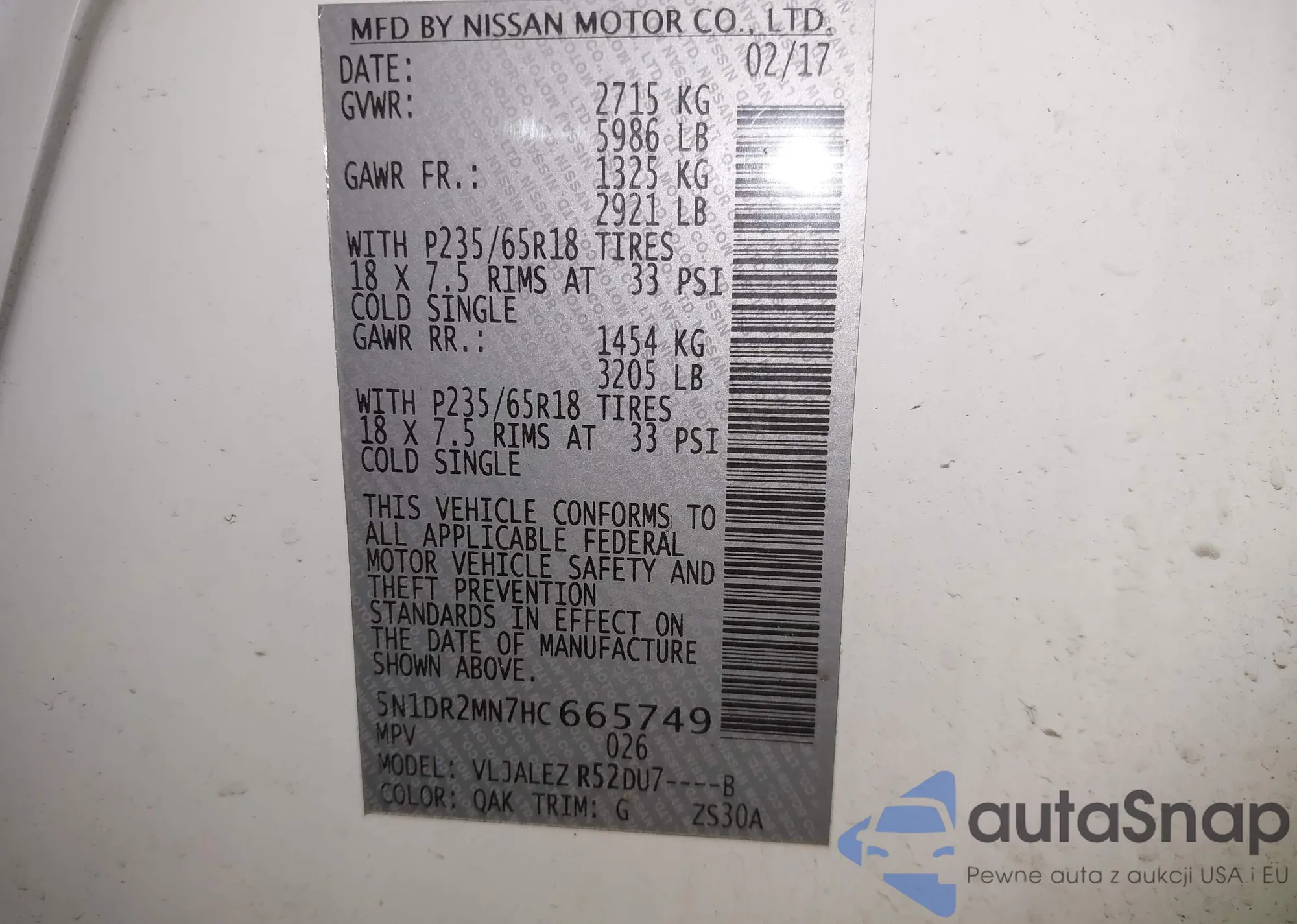Samochód Nissan Pathfinder 2017 (VIN 5N1DR2MN7HC665749) nie był wcześniej licytowany. Dokumenty są czyste, przebieg odpowiada lub jest niższy niż średnia rynku. Sprzedaje go firma ubezpieczeniowa – polecamy zakup. Dostawa do portu zajmie ok. 6–8 tygodni.