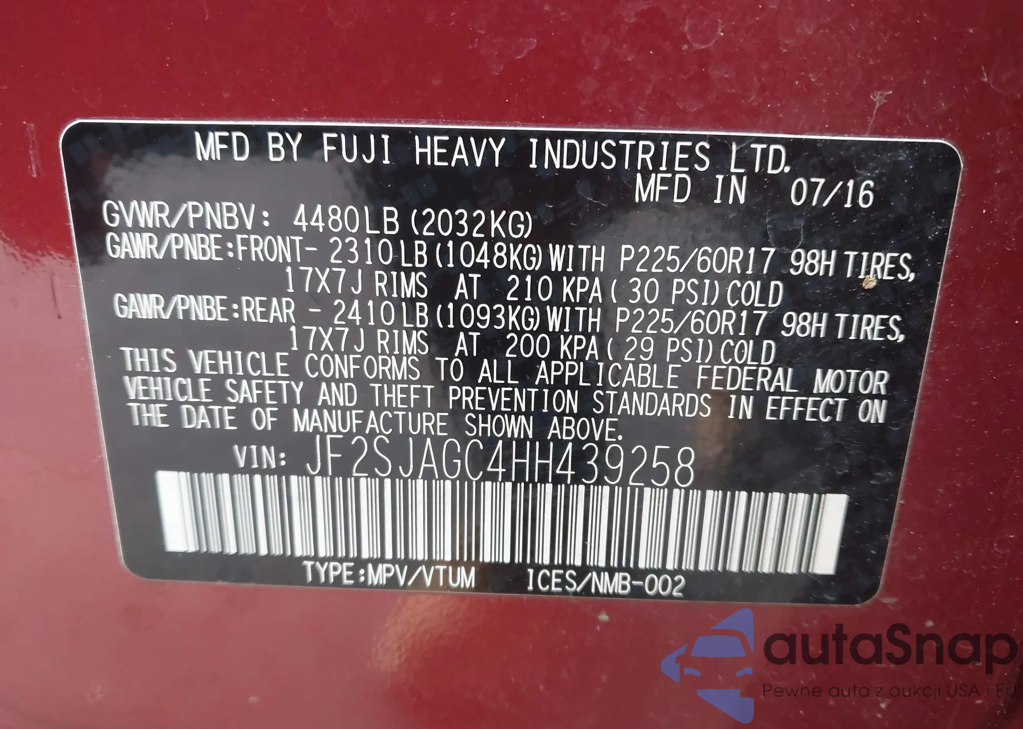 • VIN: JF2SJAGC4HH439258