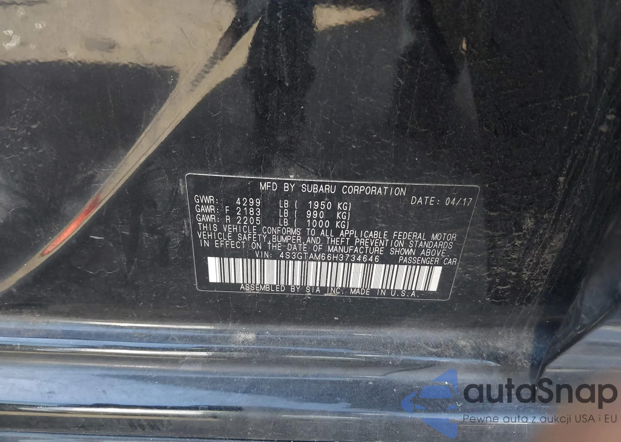 Samochód Subaru Impreza 2017 (VIN 4S3GTAM66H3734646) nie był wcześniej licytowany. Dokumenty są czyste, przebieg odpowiada lub jest niższy niż średnia rynku. Sprzedaje go firma ubezpieczeniowa – polecamy zakup. Dostawa do portu zajmie ok. 6–8 tygodni.