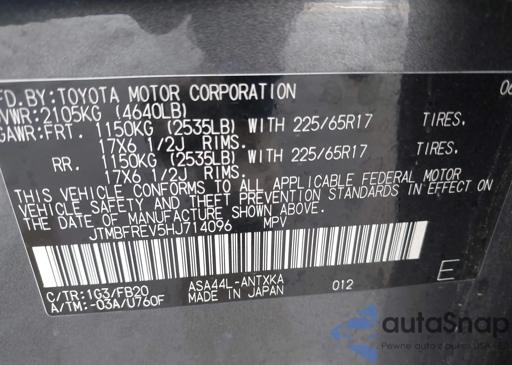 Samochód Toyota RAV 4 2017 (VIN JTMBFREV5HJ714096) nie był wcześniej licytowany. Dokumenty są czyste, przebieg odpowiada lub jest niższy niż średnia rynku. Sprzedaje go firma ubezpieczeniowa – polecamy zakup. Dostawa do portu zajmie ok. 6–8 tygodni.