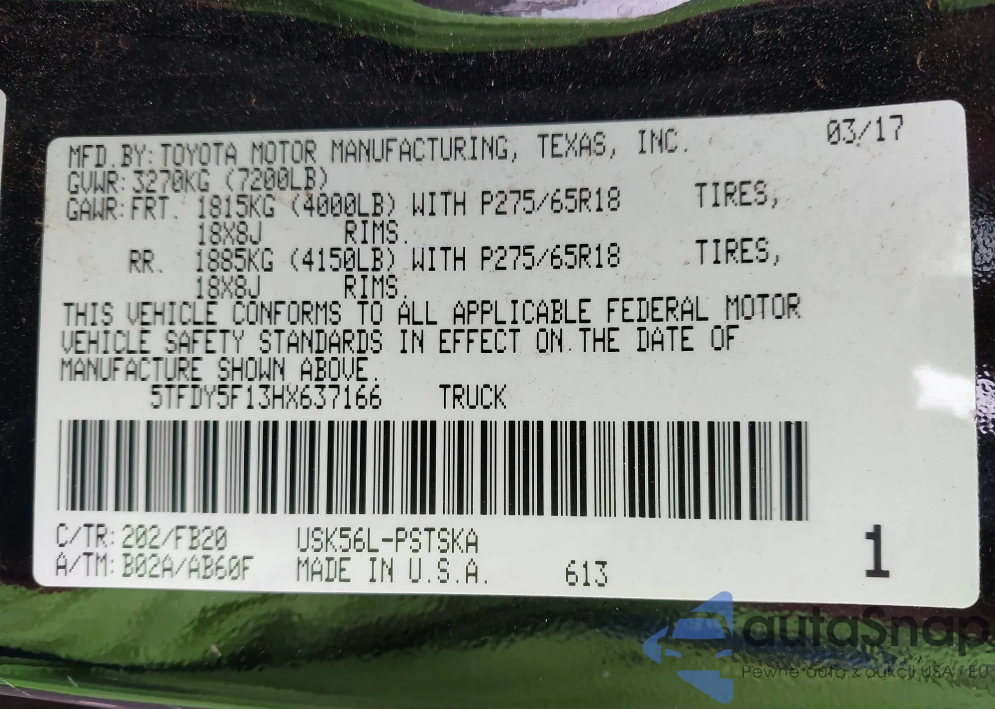 Samochód Toyota Tundra 2017 (VIN 5TFDY5F13HX637166) ma dokumenty uniemożliwiające rejestrację. Mogą pojawić się trudności przy eksporcie i rejestracji. Skontaktuj się z ekspertami AutaSnap w celu znalezienia alternatywy.