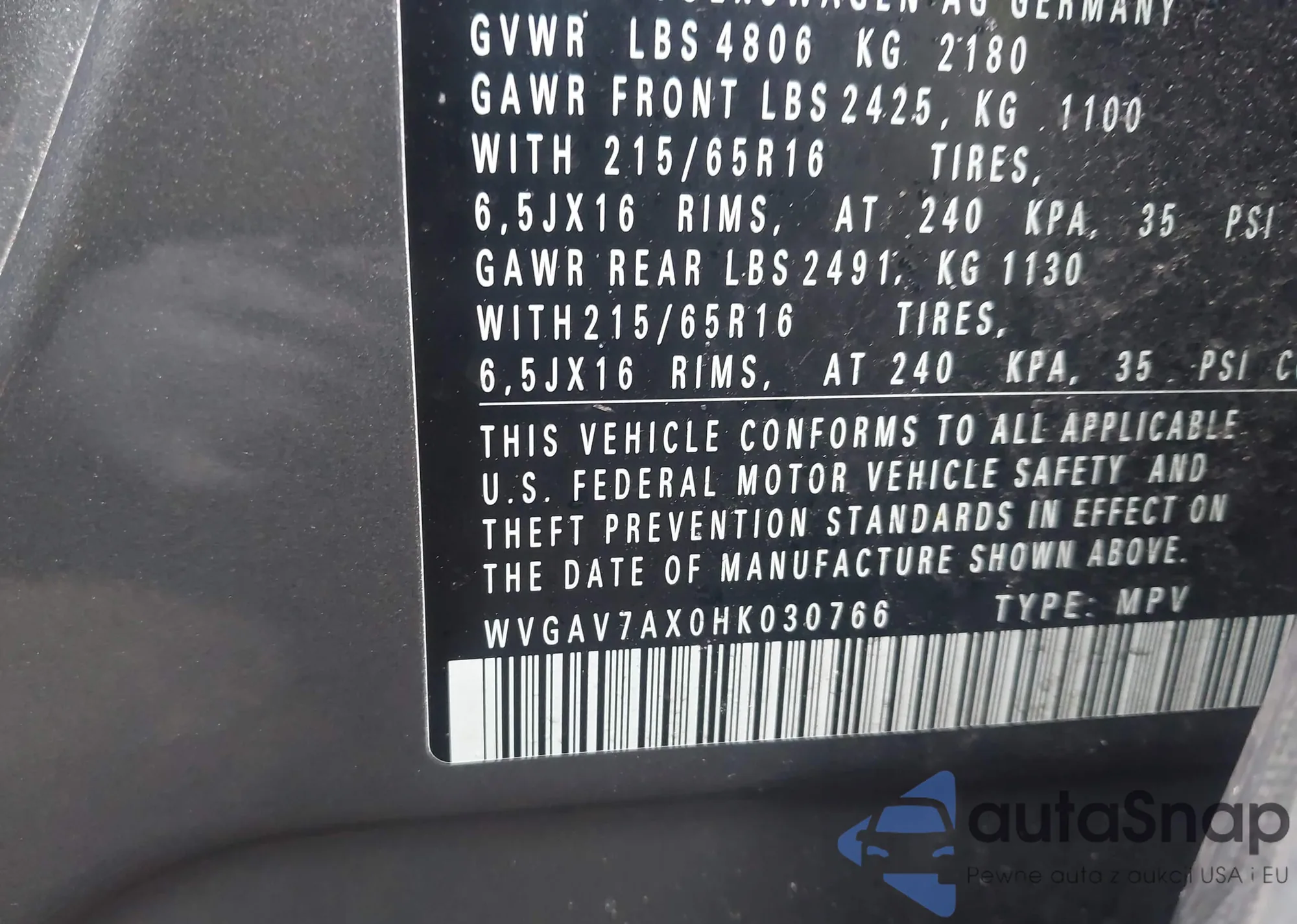 VIN: WVGAV7AX0HK030766