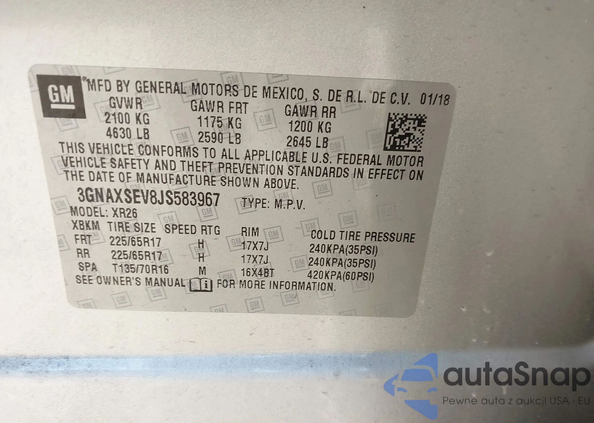 Samochód Chevrolet Equinox 2018 (VIN 3GNAXSEV8JS583967) ma dokumenty uniemożliwiające rejestrację. Mogą pojawić się trudności przy eksporcie i rejestracji. Skontaktuj się z ekspertami AutaSnap w celu znalezienia alternatywy.