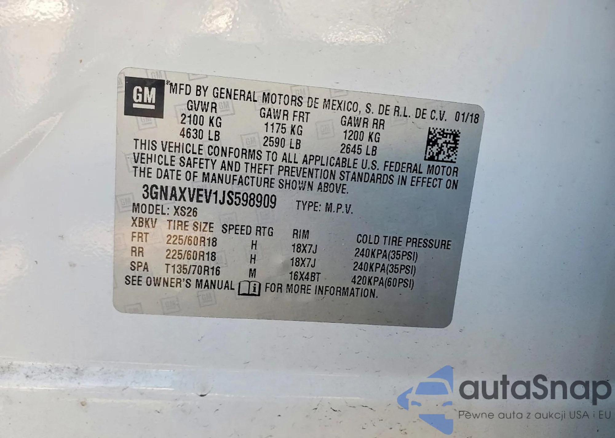 • VIN: 3GNAXVEV1JS598909