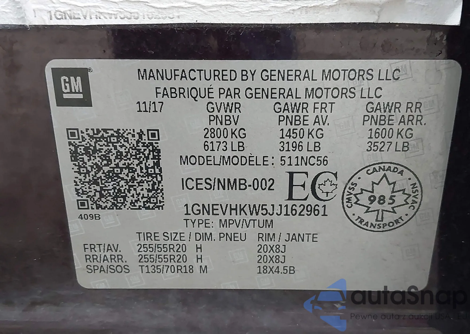 Samochód Chevrolet Traverse 2018 (VIN 1GNEVHKW5JJ162961) ma dokumenty uniemożliwiające rejestrację. Mogą pojawić się trudności przy eksporcie i rejestracji. Skontaktuj się z ekspertami AutaSnap w celu znalezienia alternatywy.