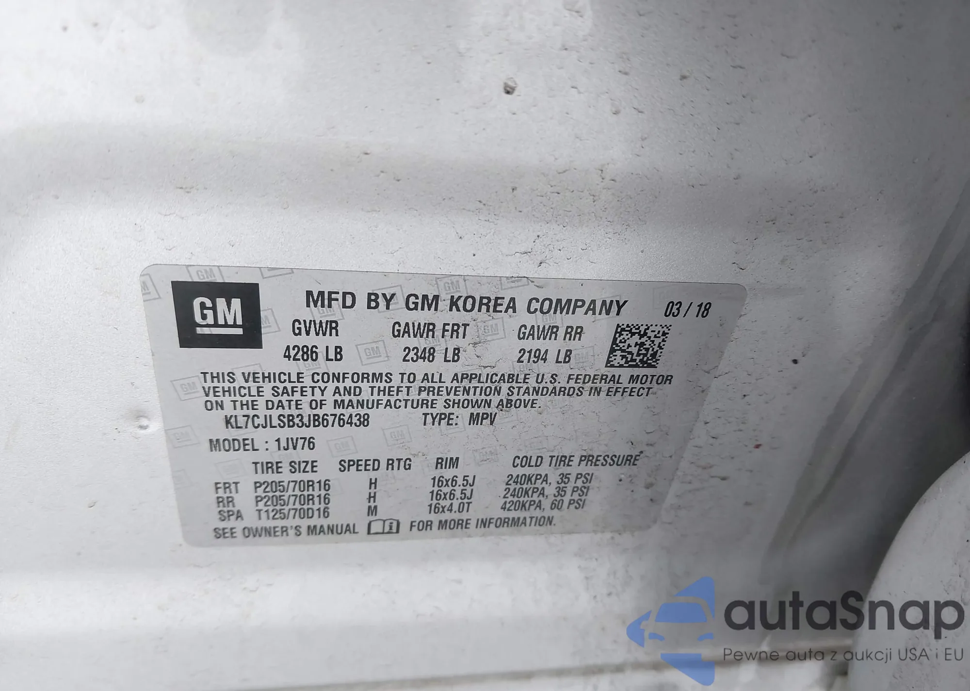• VIN: KL7CJLSB3JB676438