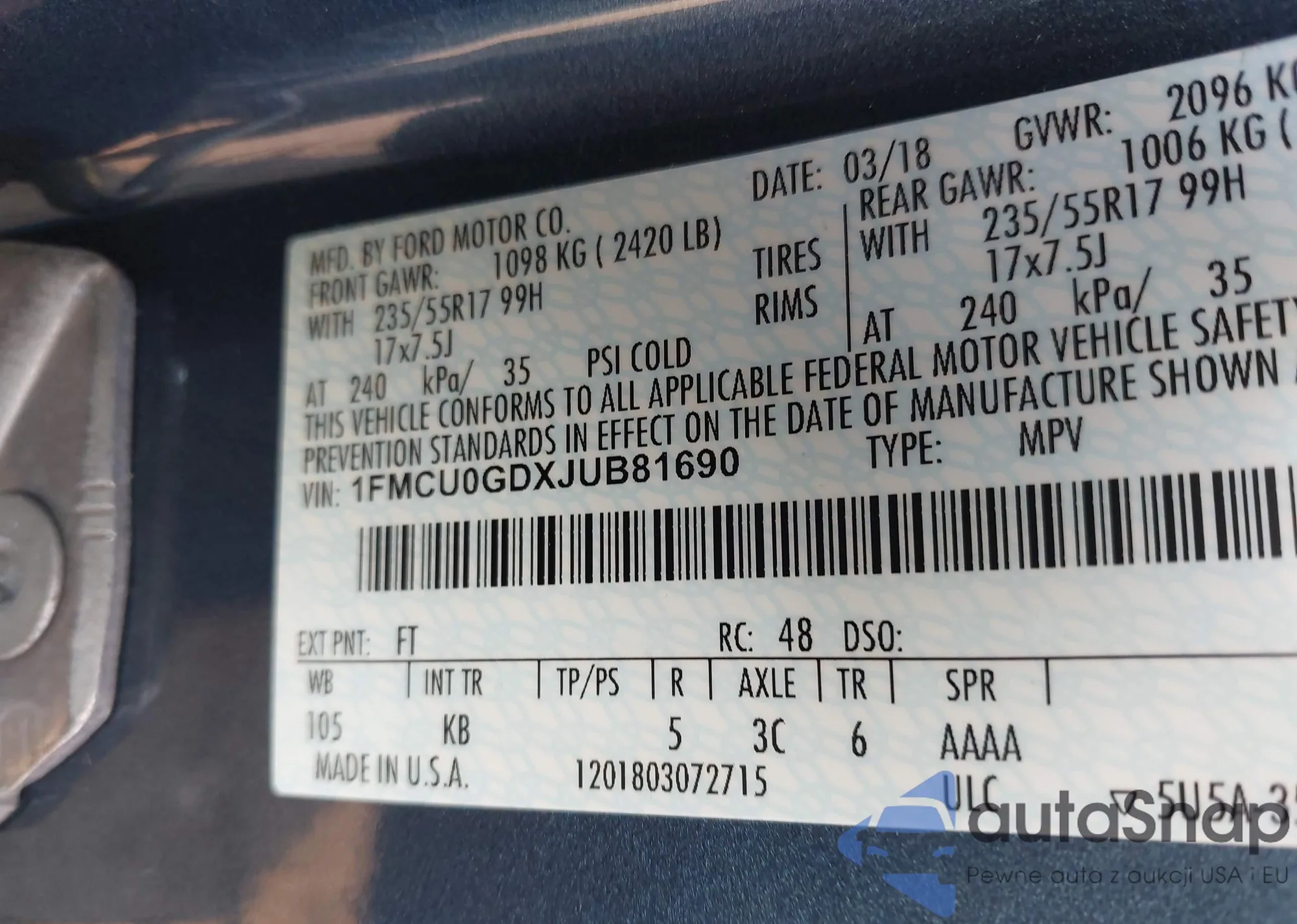 • VIN: 1FMCU0GDXJUB81690