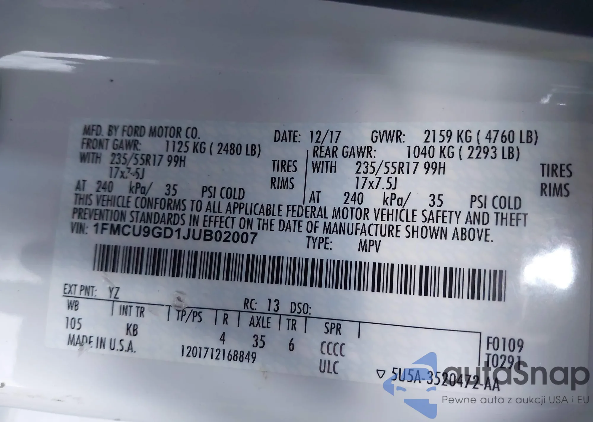 • VIN: 1FMCU9GD1JUB02007