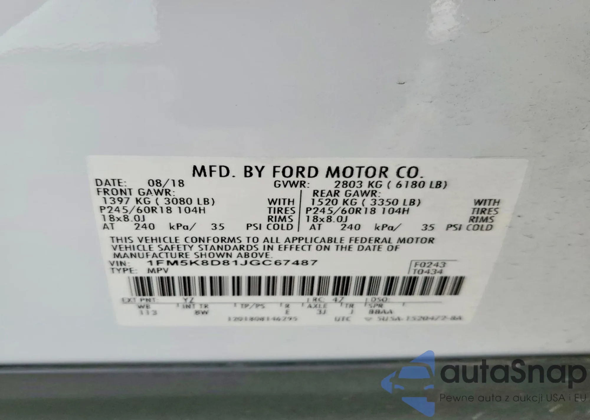 Samochód Ford Explorer 2018 (VIN 1FM5K8D81JGC67487) nie był wcześniej licytowany. Dokumenty są czyste, przebieg odpowiada lub jest niższy niż średnia rynku. Sprzedaje go firma ubezpieczeniowa – polecamy zakup. Dostawa do portu zajmie ok. 6–8 tygodni.