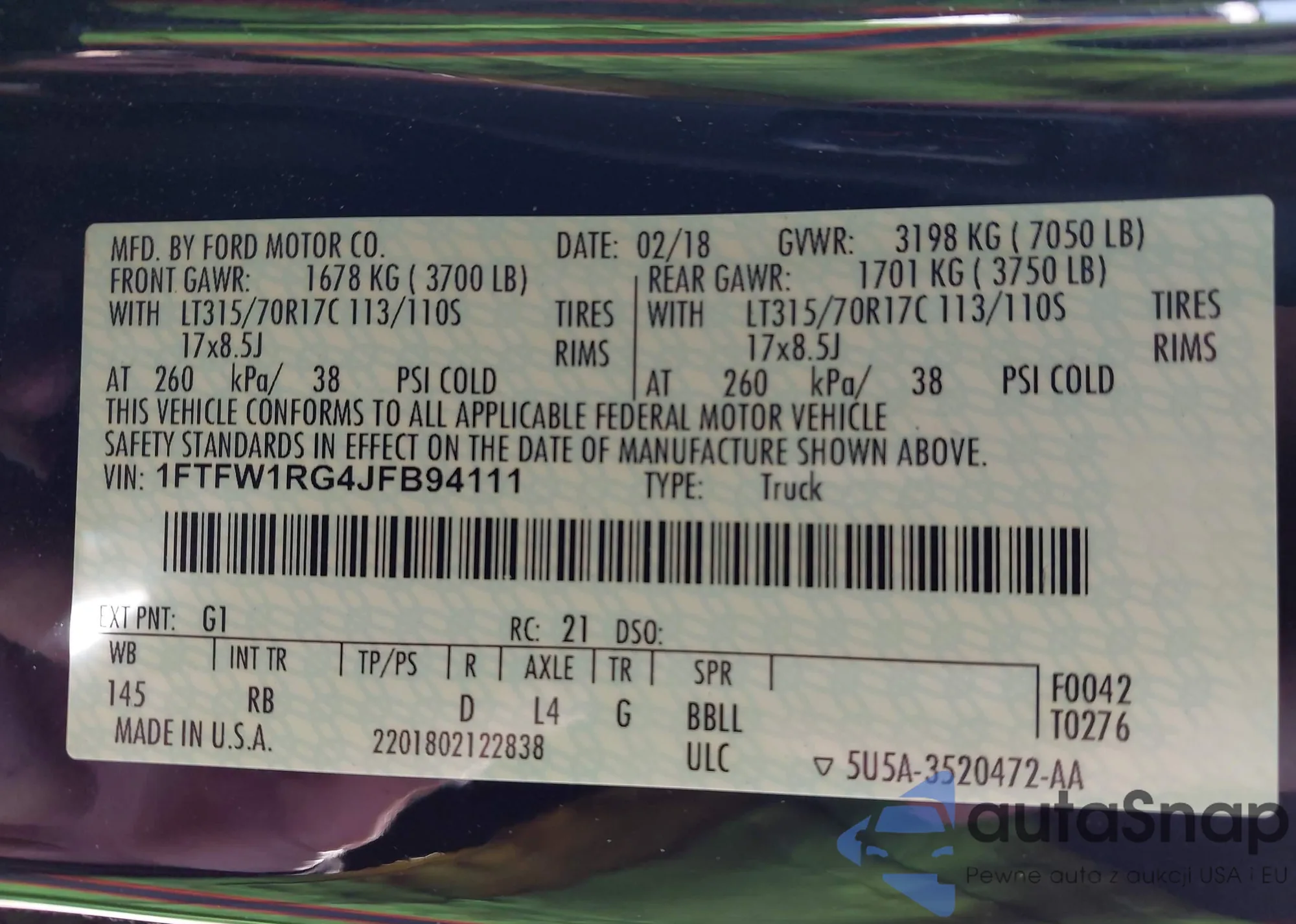 • VIN: 1FTFW1RG4JFB94111