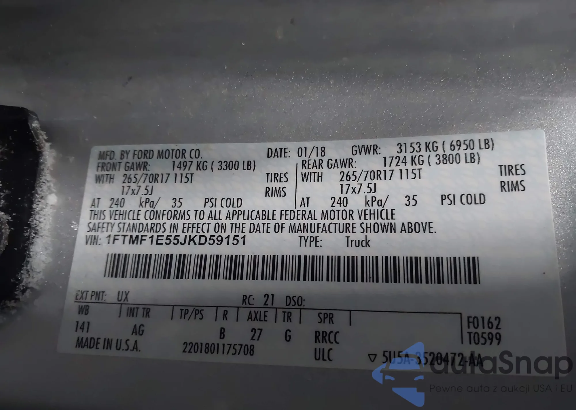 Samochód Ford F-150 2018 (VIN 1FTMF1E55JKD59151) nie był wcześniej licytowany. Dokumenty są czyste, przebieg odpowiada lub jest niższy niż średnia rynku. Sprzedaje go firma ubezpieczeniowa – polecamy zakup. Dostawa do portu zajmie ok. 6–8 tygodni.
