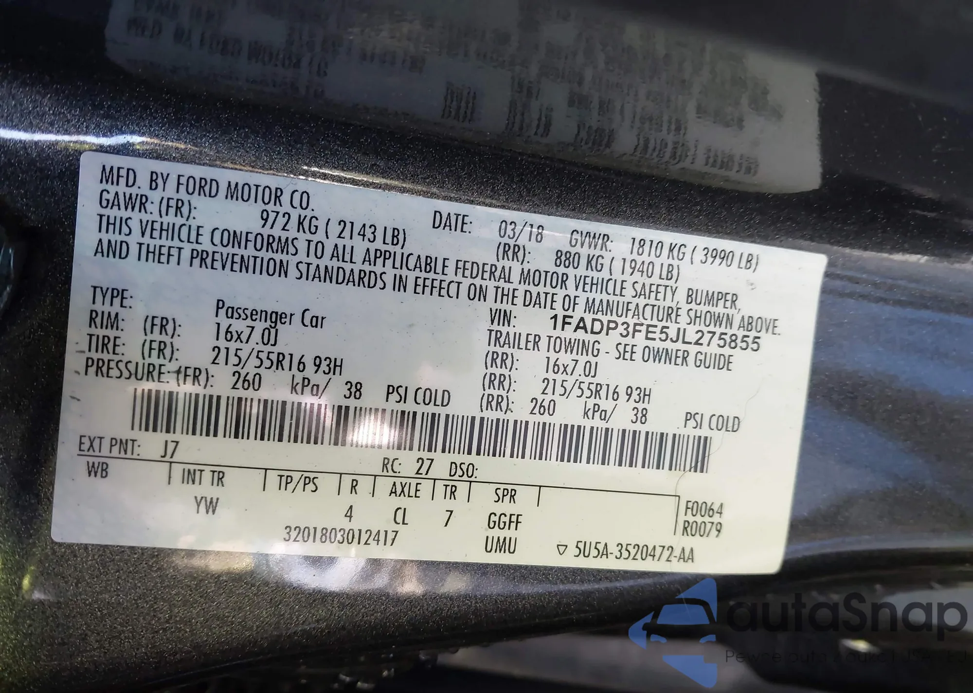 • VIN: 1FADP3FE5JL275855