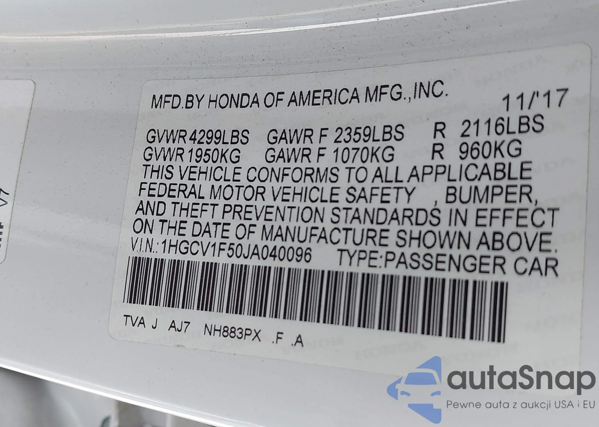 VIN: 1HGCV1F50JA040096