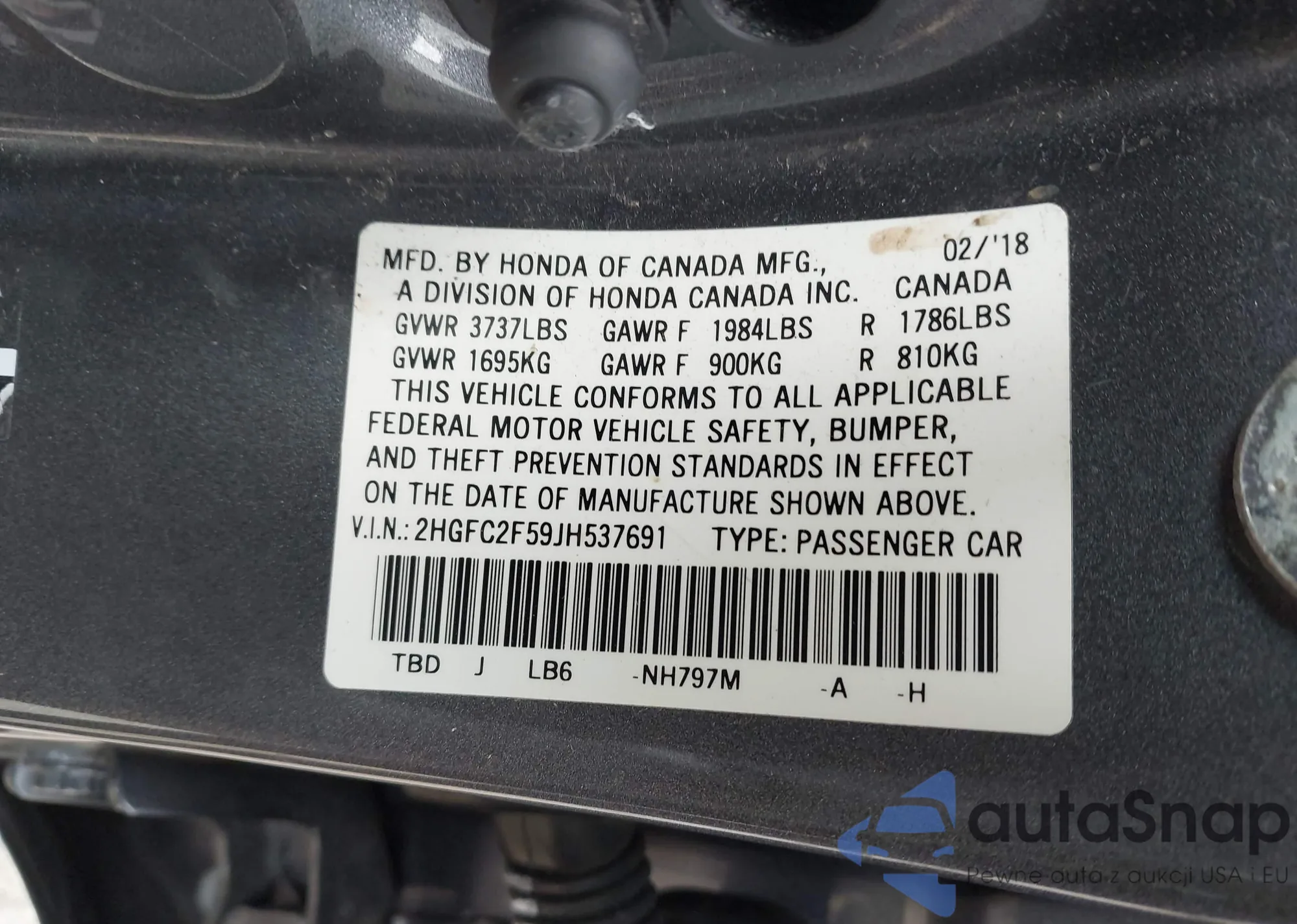 Samochód Honda Civic 2018 (VIN 2HGFC2F59JH537691) nie był wcześniej licytowany. Dokumenty są czyste, przebieg odpowiada lub jest niższy niż średnia rynku. Sprzedaje go firma ubezpieczeniowa – polecamy zakup. Dostawa do portu zajmie ok. 6–8 tygodni.