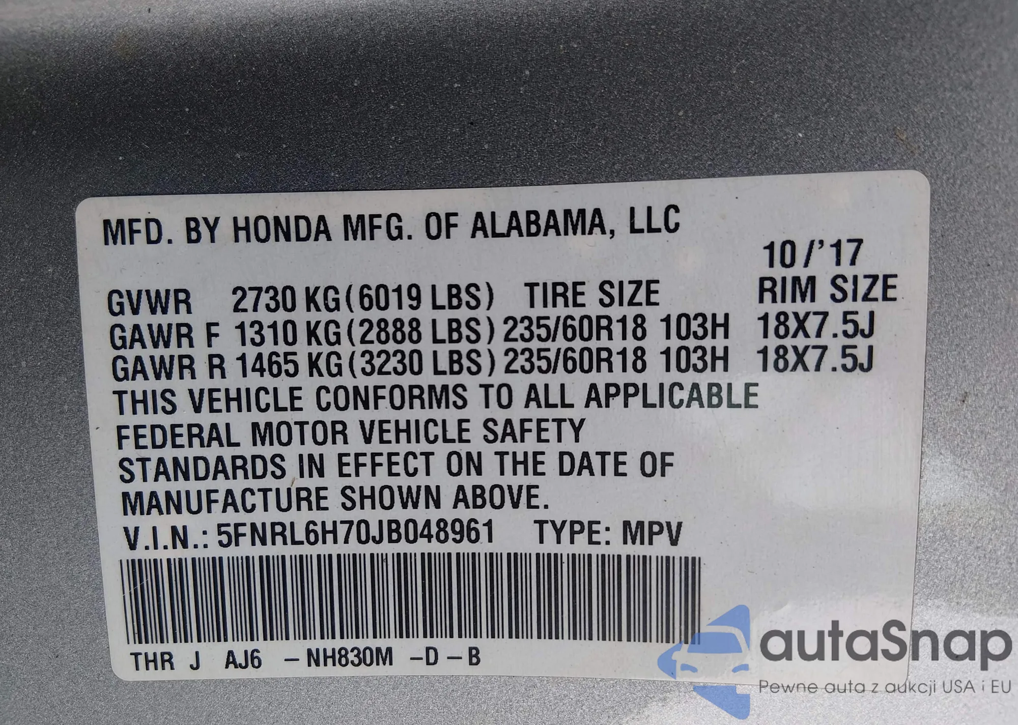 • VIN: 5FNRL6H70JB048961