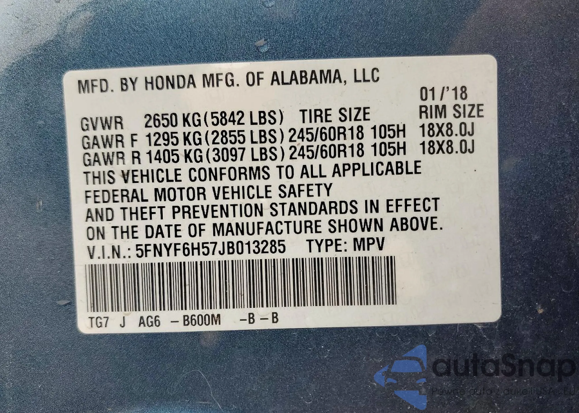 VIN: 5FNYF6H57JB013285