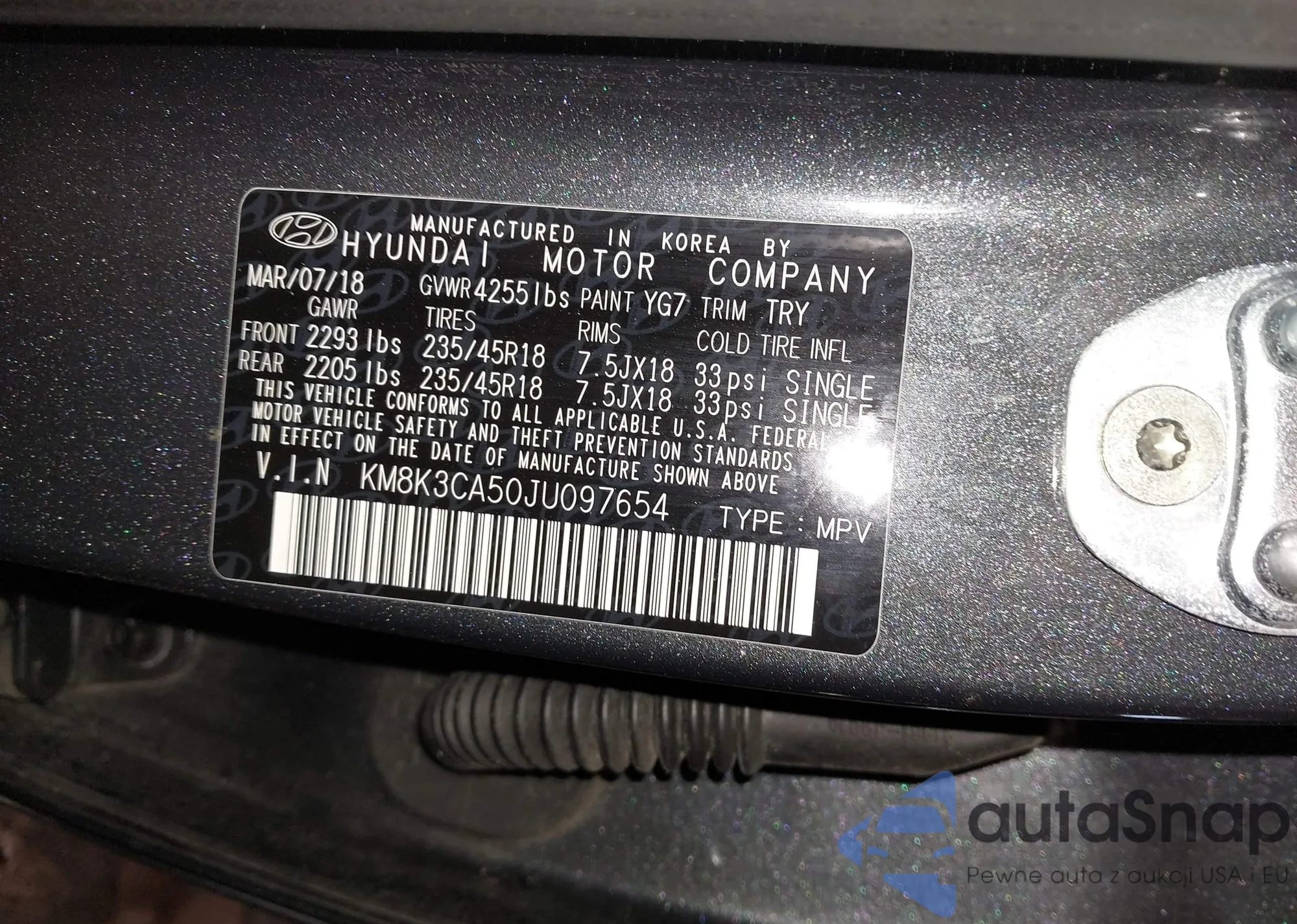 Samochód Hyundai Kona 2018 (VIN KM8K3CA50JU097654) ma dokumenty uniemożliwiające rejestrację. Mogą pojawić się trudności przy eksporcie i rejestracji. Skontaktuj się z ekspertami AutaSnap w celu znalezienia alternatywy.