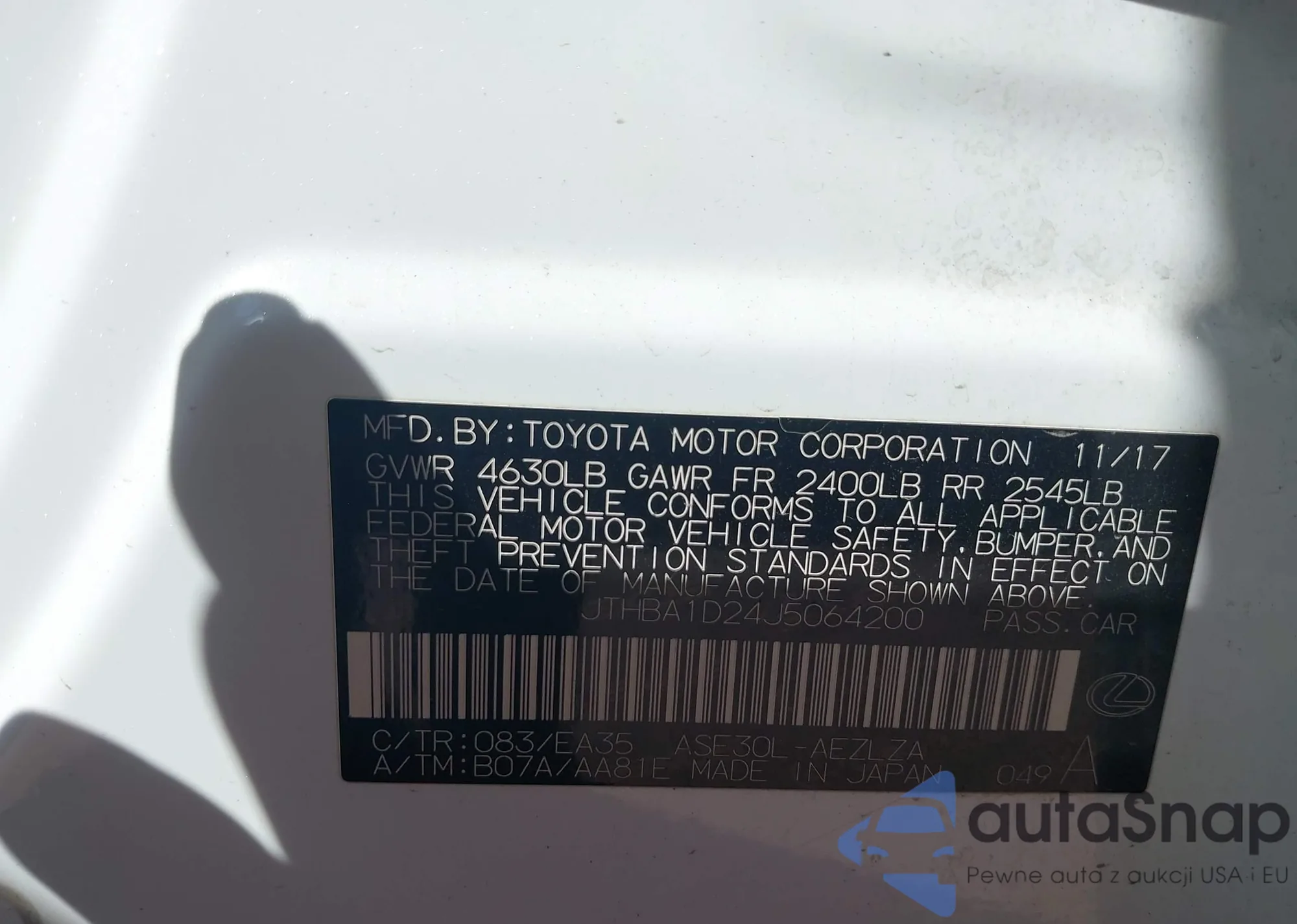 Samochód Lexus IS 2018 (VIN JTHBA1D24J5064200) nie był wcześniej licytowany. Dokumenty są czyste, przebieg odpowiada lub jest niższy niż średnia rynku. Sprzedaje go firma ubezpieczeniowa – polecamy zakup. Dostawa do portu zajmie ok. 6–8 tygodni.