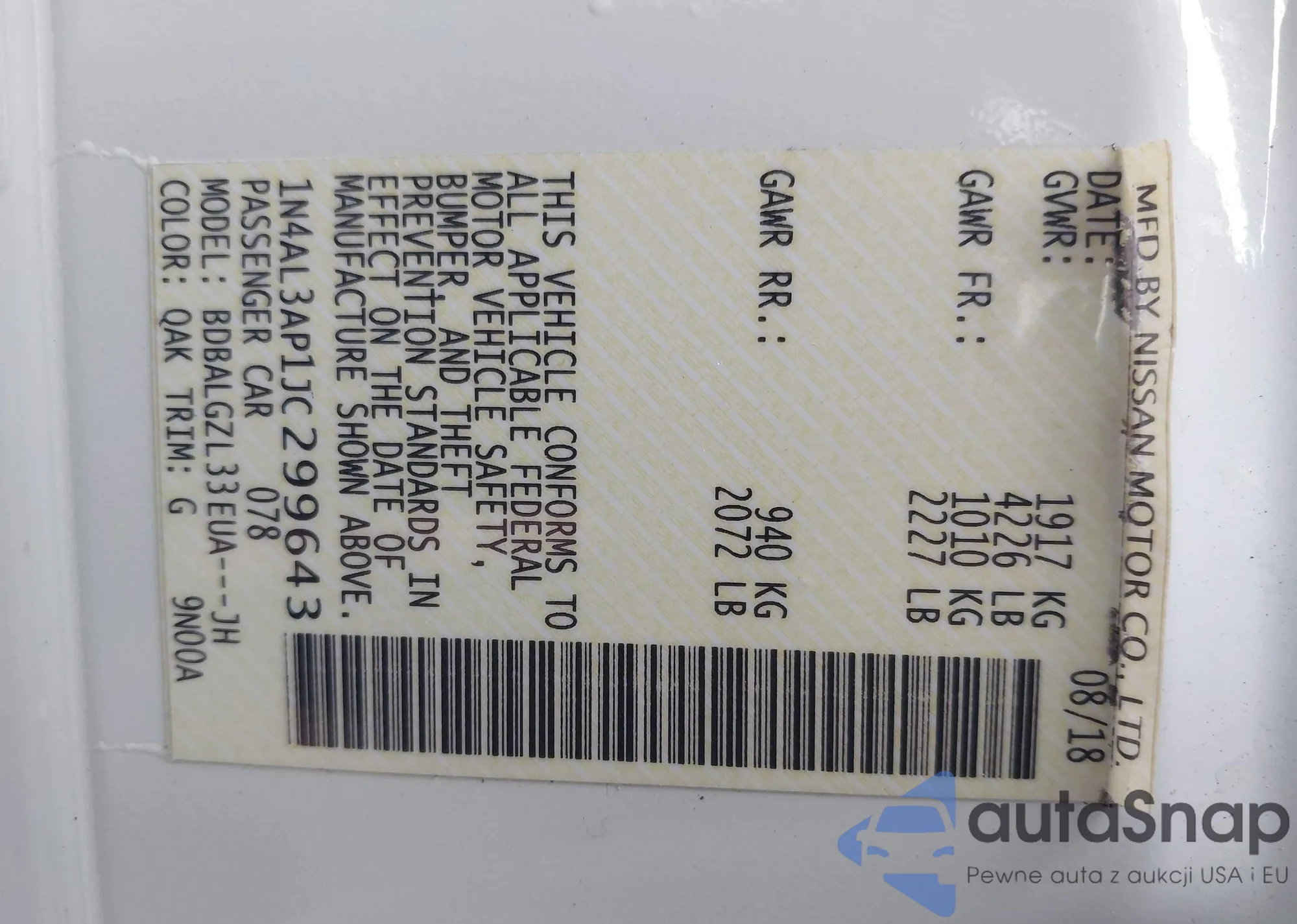Samochód Nissan Altima 2018 (VIN 1N4AL3AP1JC299643) był już licytowany 1 razy i/lub sprzedaje go niezweryfikowany sprzedawca. Zalecamy raport Carfax i potwierdzenie możliwości rejestracji pojazdu przed zakupem.