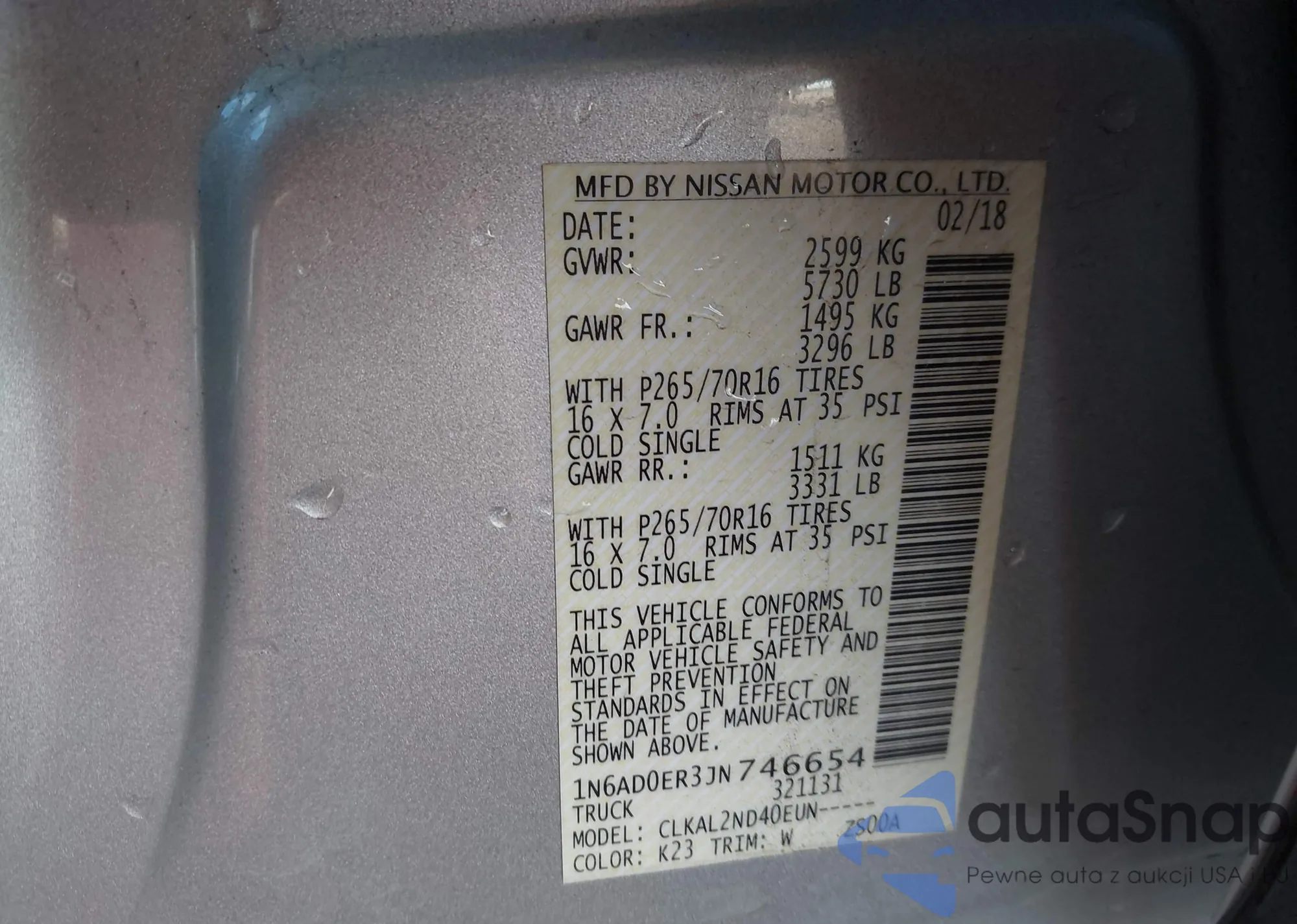 Samochód Nissan Navara (Frontier) 2018 (VIN 1N6AD0ER3JN746654) nie był wcześniej licytowany. Dokumenty są czyste, przebieg odpowiada lub jest niższy niż średnia rynku. Sprzedaje go firma ubezpieczeniowa – polecamy zakup. Dostawa do portu zajmie ok. 6–8 tygodni.