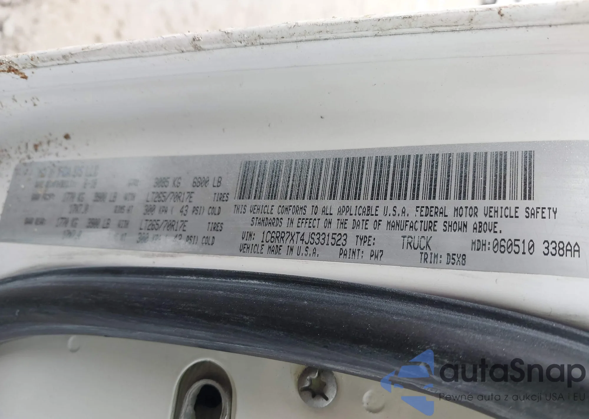 Samochód RAM 1500 2018 (VIN 1C6RR7XT4JS331523) nie był wcześniej licytowany. Dokumenty są czyste, przebieg odpowiada lub jest niższy niż średnia rynku. Sprzedaje go firma ubezpieczeniowa – polecamy zakup. Dostawa do portu zajmie ok. 6–8 tygodni.