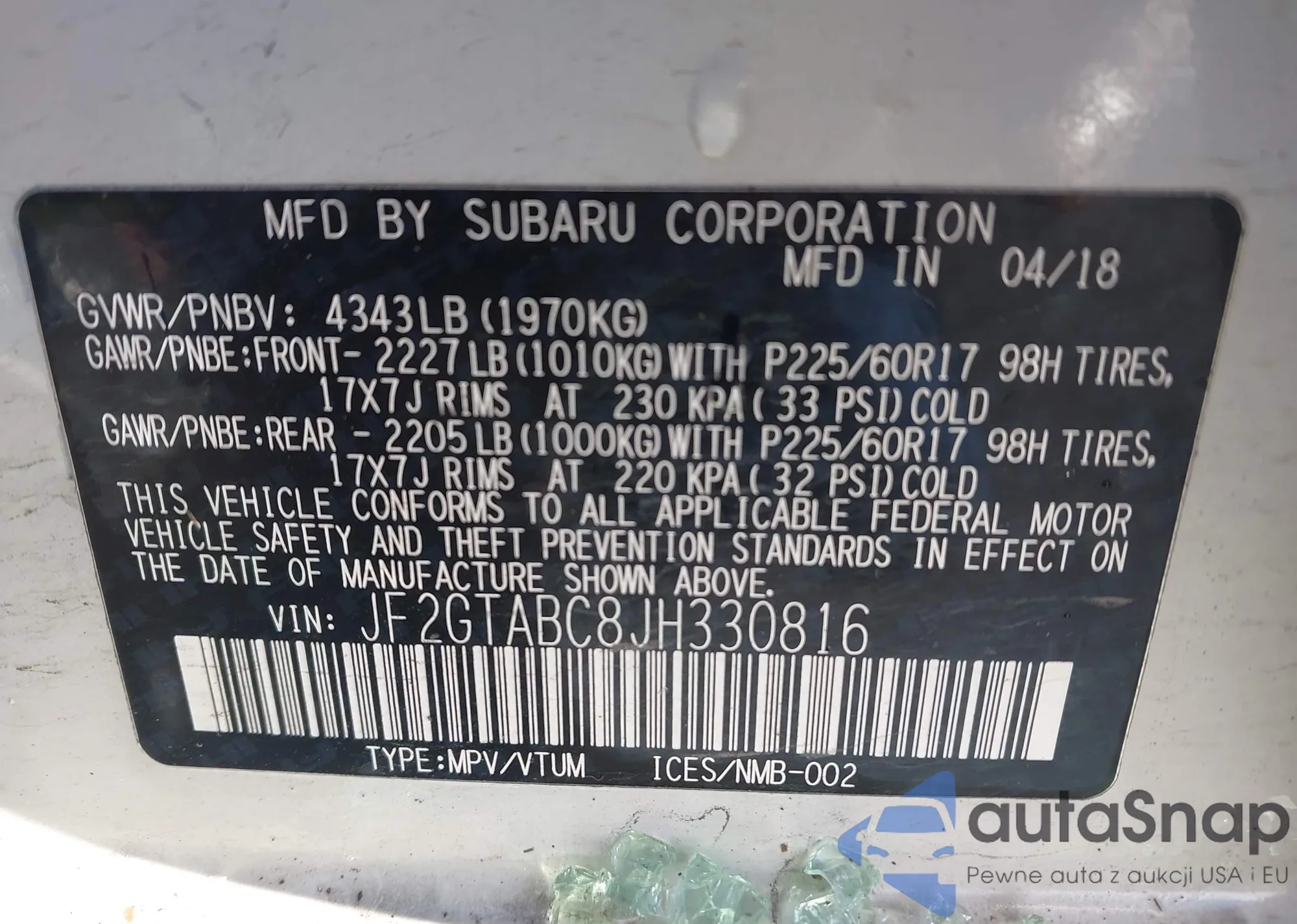 Samochód Subaru XV 2018 (VIN JF2GTABC8JH330816) ma dokumenty uniemożliwiające rejestrację. Mogą pojawić się trudności przy eksporcie i rejestracji. Skontaktuj się z ekspertami AutaSnap w celu znalezienia alternatywy.