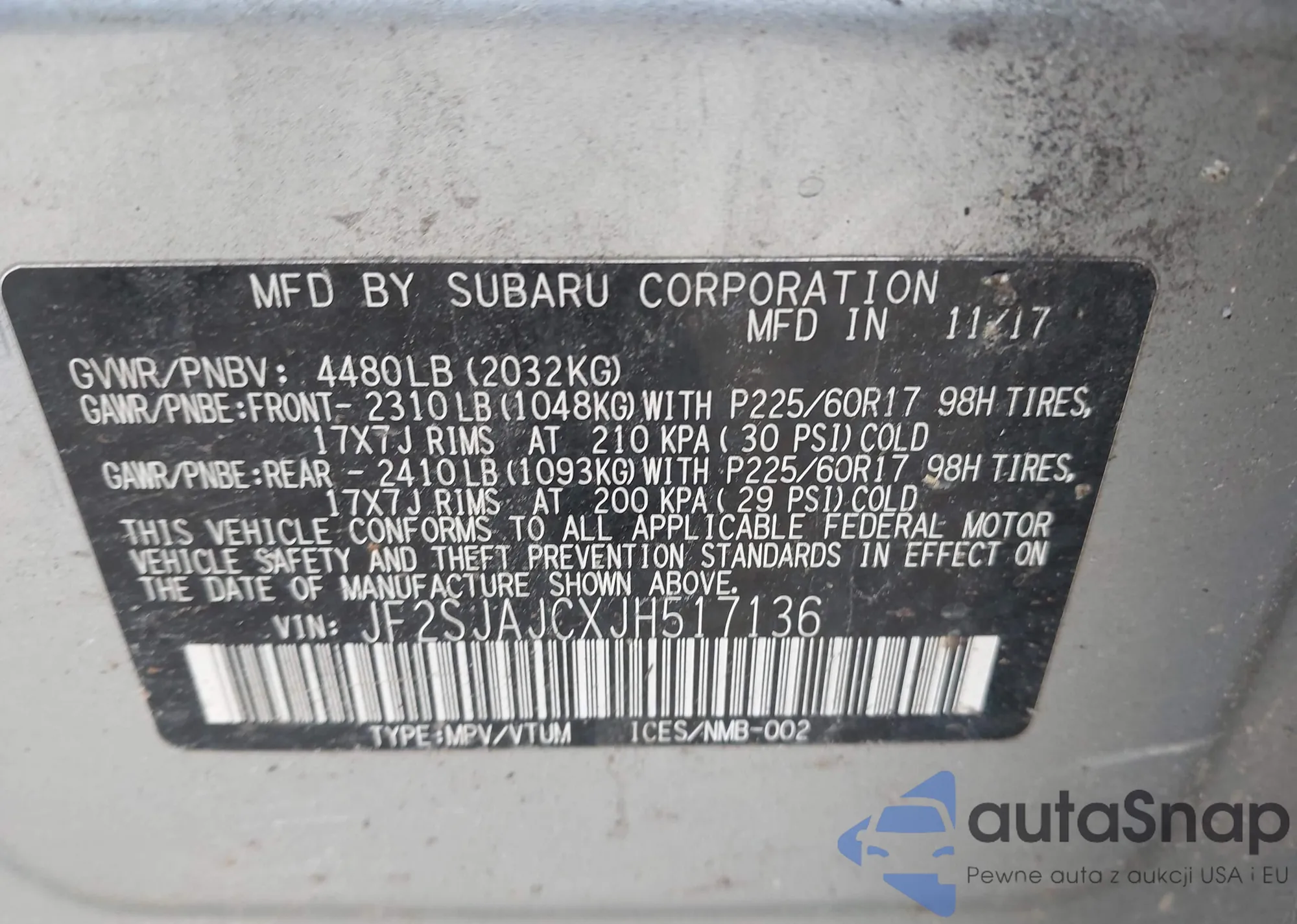Samochód Subaru Forester 2018 (VIN JF2SJAJCXJH517136) nie był wcześniej licytowany. Dokumenty są czyste, przebieg odpowiada lub jest niższy niż średnia rynku. Sprzedaje go firma ubezpieczeniowa – polecamy zakup. Dostawa do portu zajmie ok. 6–8 tygodni.