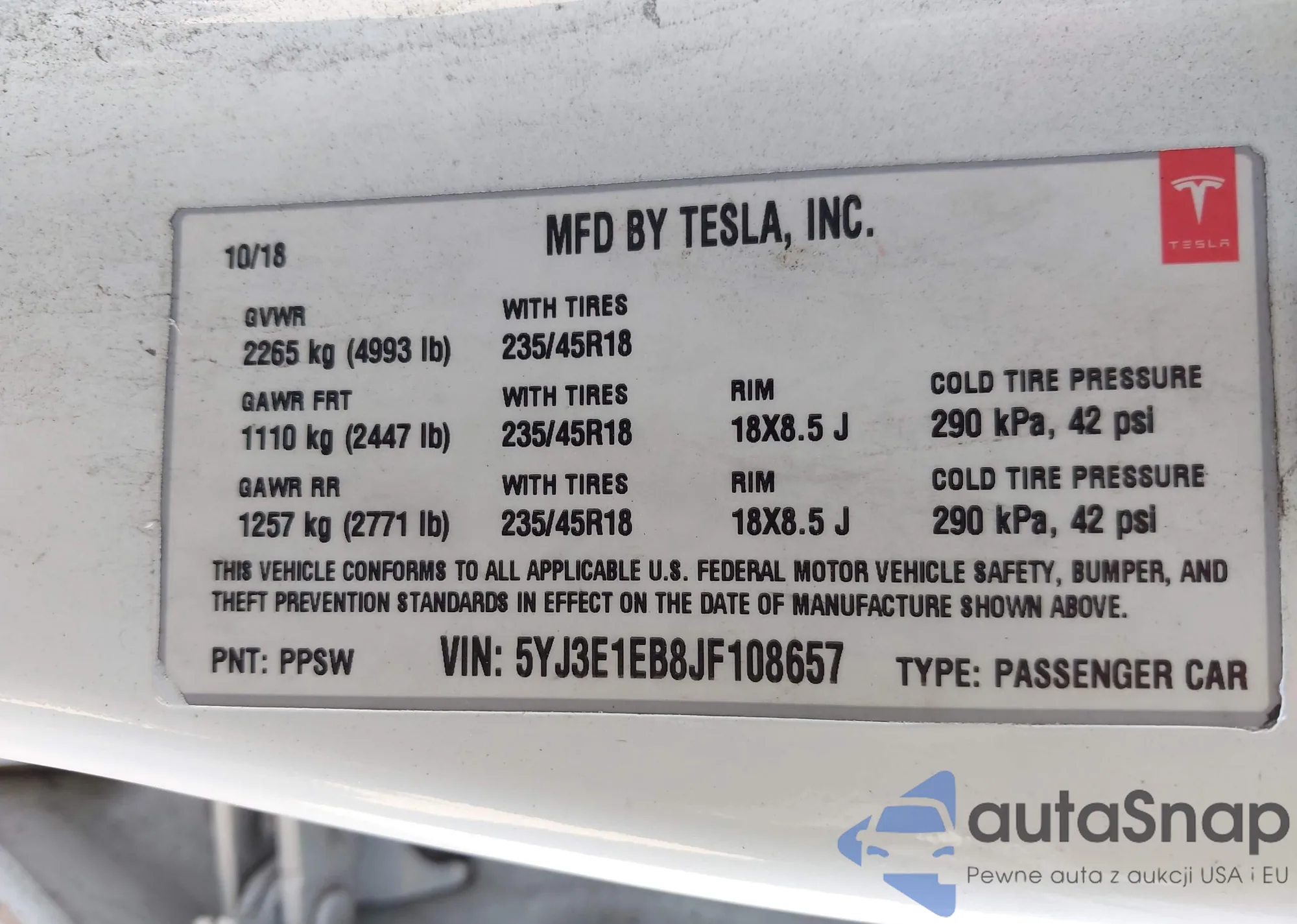 Samochód Tesla Model 3 2018 (VIN 5YJ3E1EB8JF108657) nie był wcześniej licytowany. Dokumenty są czyste, przebieg odpowiada lub jest niższy niż średnia rynku. Sprzedaje go firma ubezpieczeniowa – polecamy zakup. Dostawa do portu zajmie ok. 6–8 tygodni.