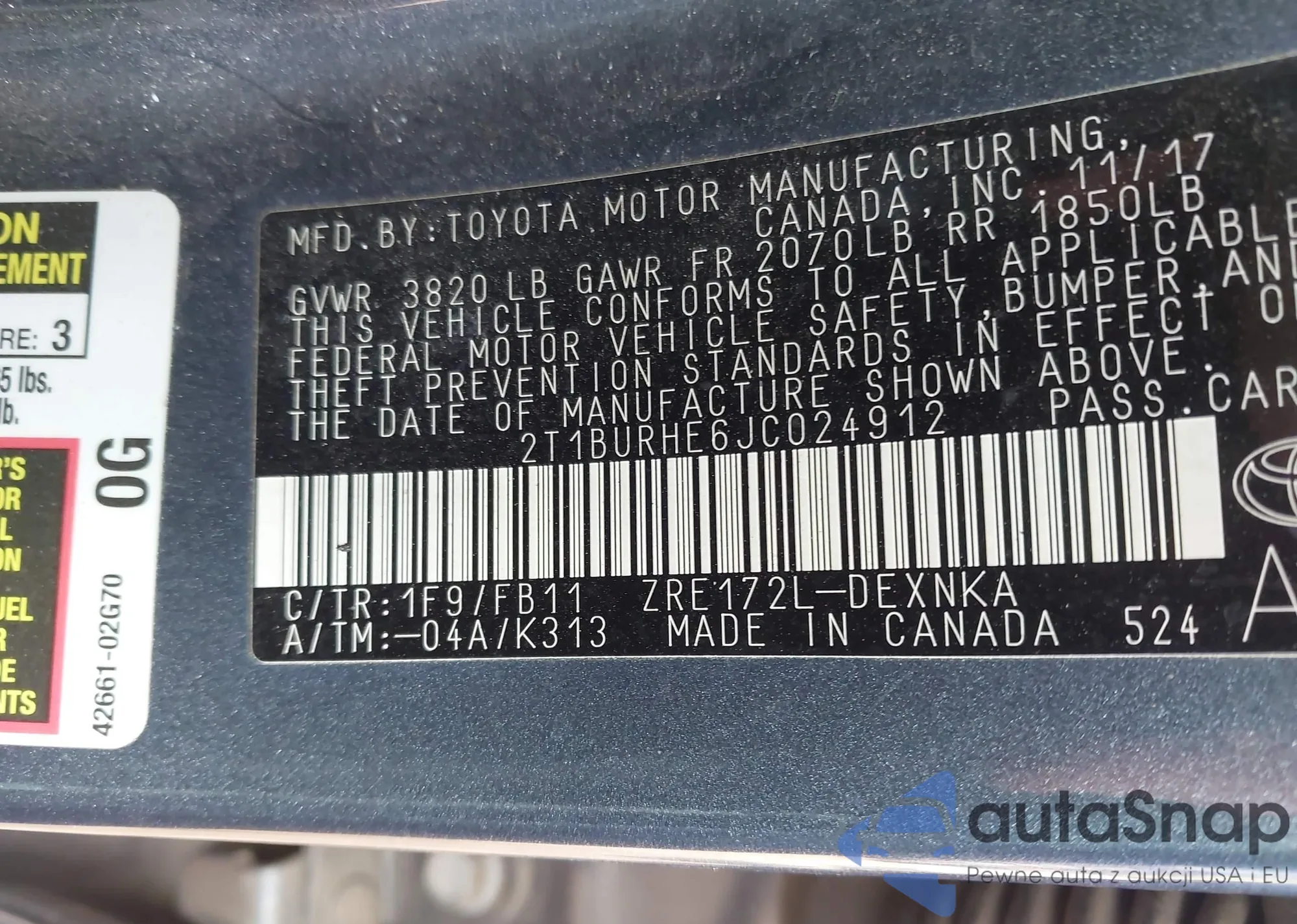 Samochód Toyota Corolla 2018 (VIN 2T1BURHE6JC024912) nie był wcześniej licytowany. Dokumenty są czyste, przebieg odpowiada lub jest niższy niż średnia rynku. Sprzedaje go firma ubezpieczeniowa – polecamy zakup. Dostawa do portu zajmie ok. 6–8 tygodni.