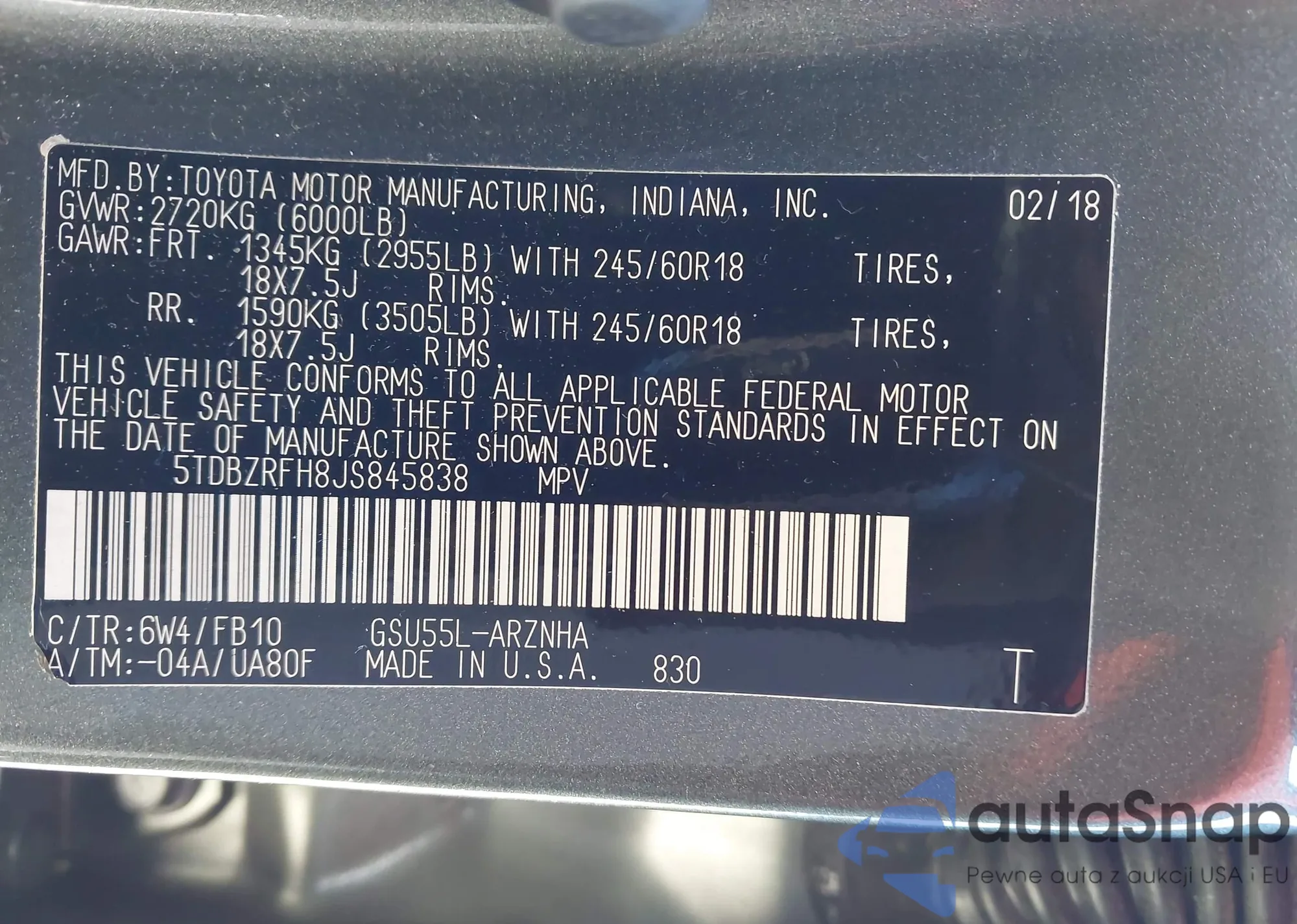 • VIN: 5TDBZRFH8JS845838