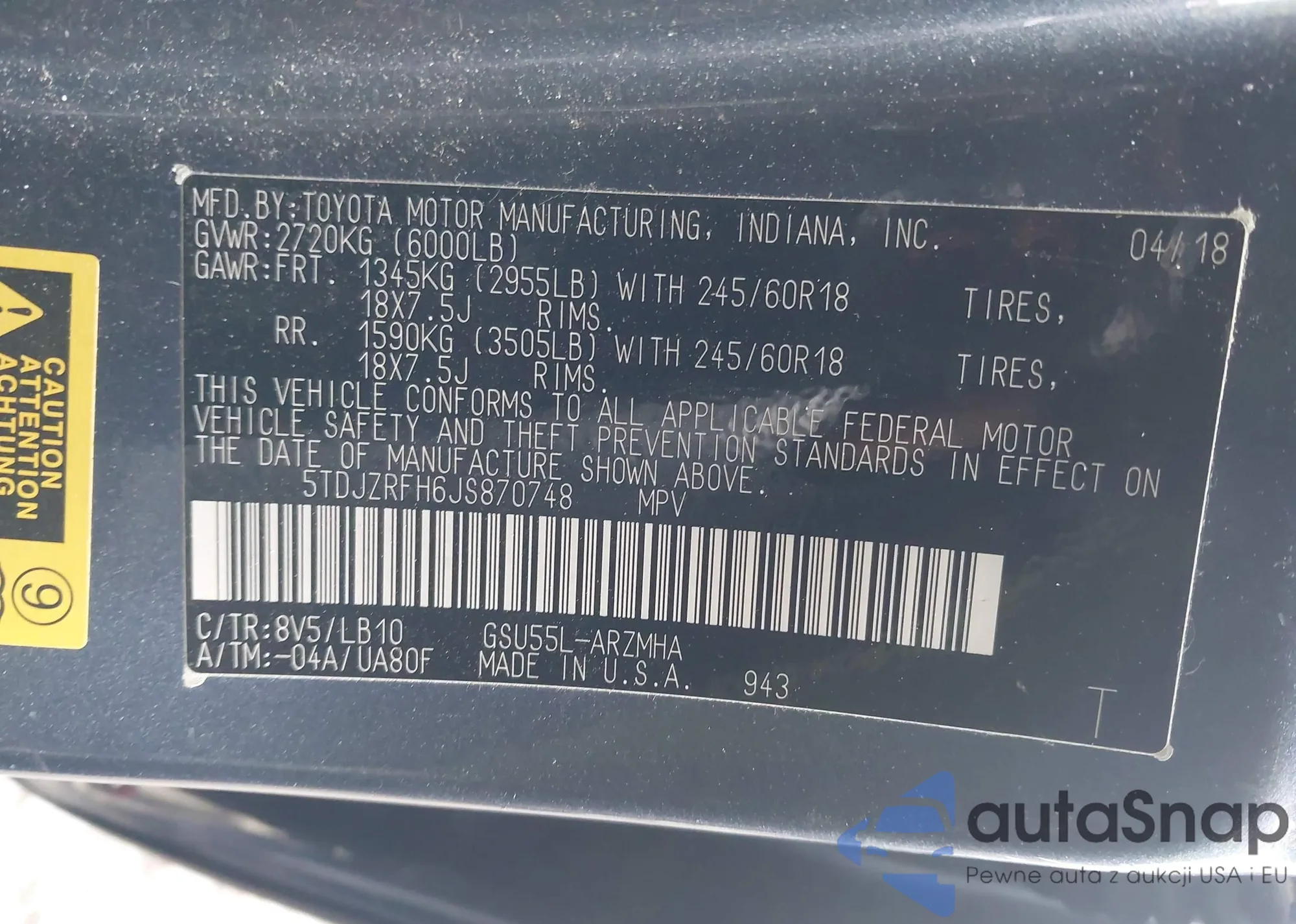 Samochód Toyota Highlander 2018 (VIN 5TDJZRFH6JS870748) nie był wcześniej licytowany. Dokumenty są czyste, przebieg odpowiada lub jest niższy niż średnia rynku. Sprzedaje go firma ubezpieczeniowa – polecamy zakup. Dostawa do portu zajmie ok. 6–8 tygodni.