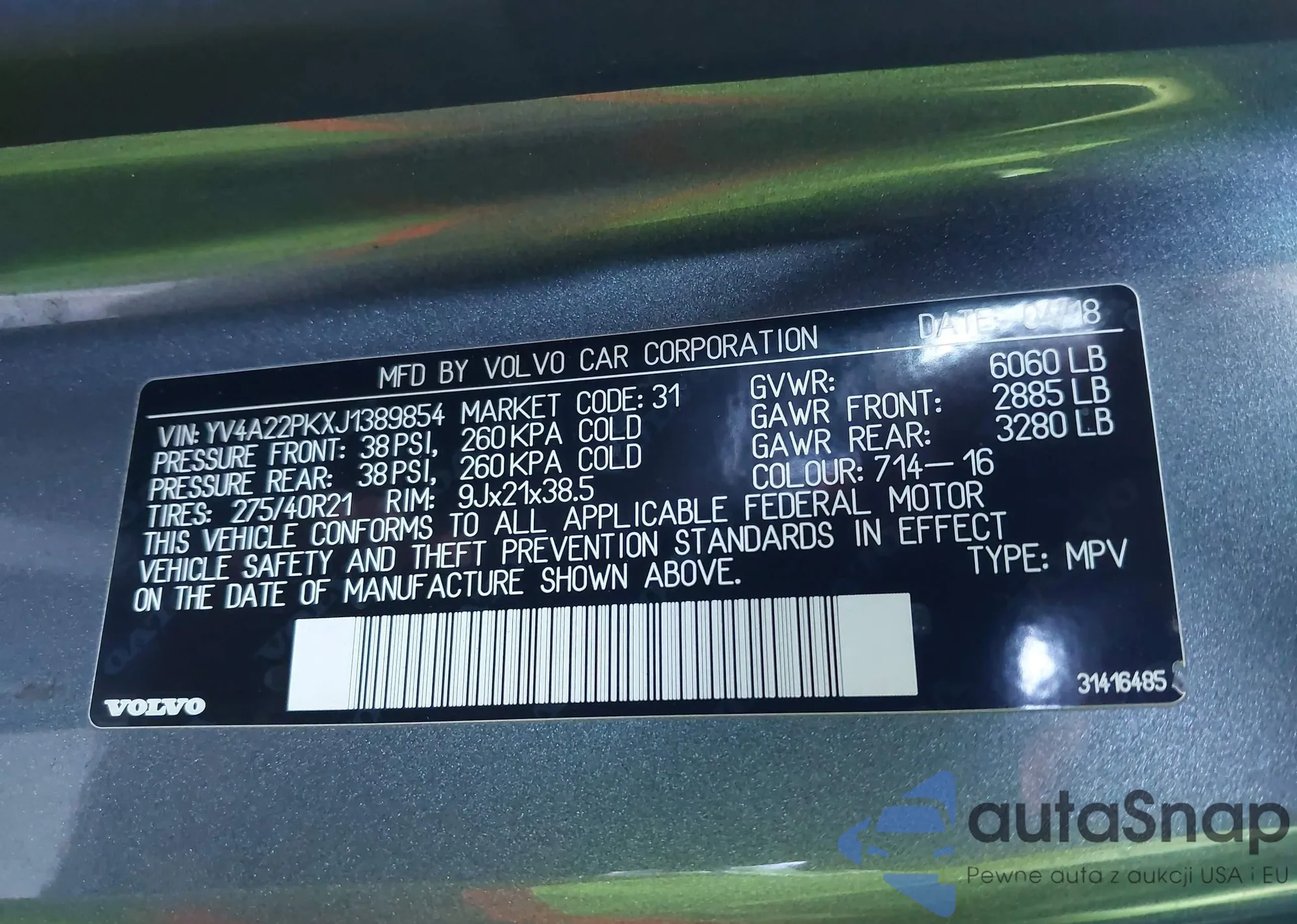 • VIN: YV4A22PKXJ1389854