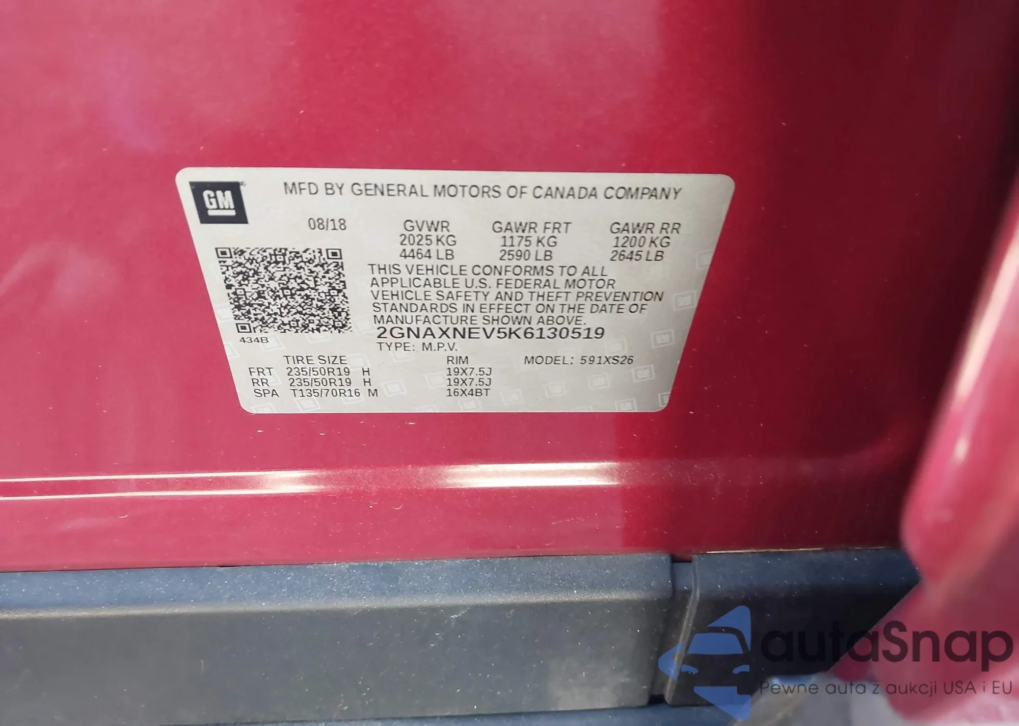 Samochód Chevrolet Equinox 2019 (VIN 2GNAXNEV5K6130519) nie był wcześniej licytowany. Dokumenty są czyste, przebieg odpowiada lub jest niższy niż średnia rynku. Sprzedaje go firma ubezpieczeniowa – polecamy zakup. Dostawa do portu zajmie ok. 6–8 tygodni.