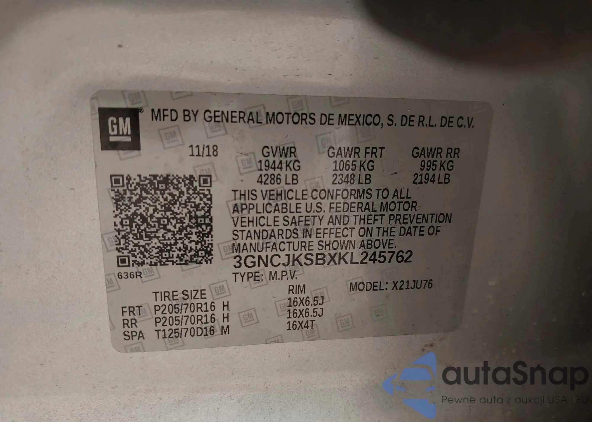 Samochód Chevrolet Trax 2019 (VIN 3GNCJKSBXKL245762) nie był wcześniej licytowany. Dokumenty są czyste, przebieg odpowiada lub jest niższy niż średnia rynku. Sprzedaje go firma ubezpieczeniowa – polecamy zakup. Dostawa do portu zajmie ok. 6–8 tygodni.