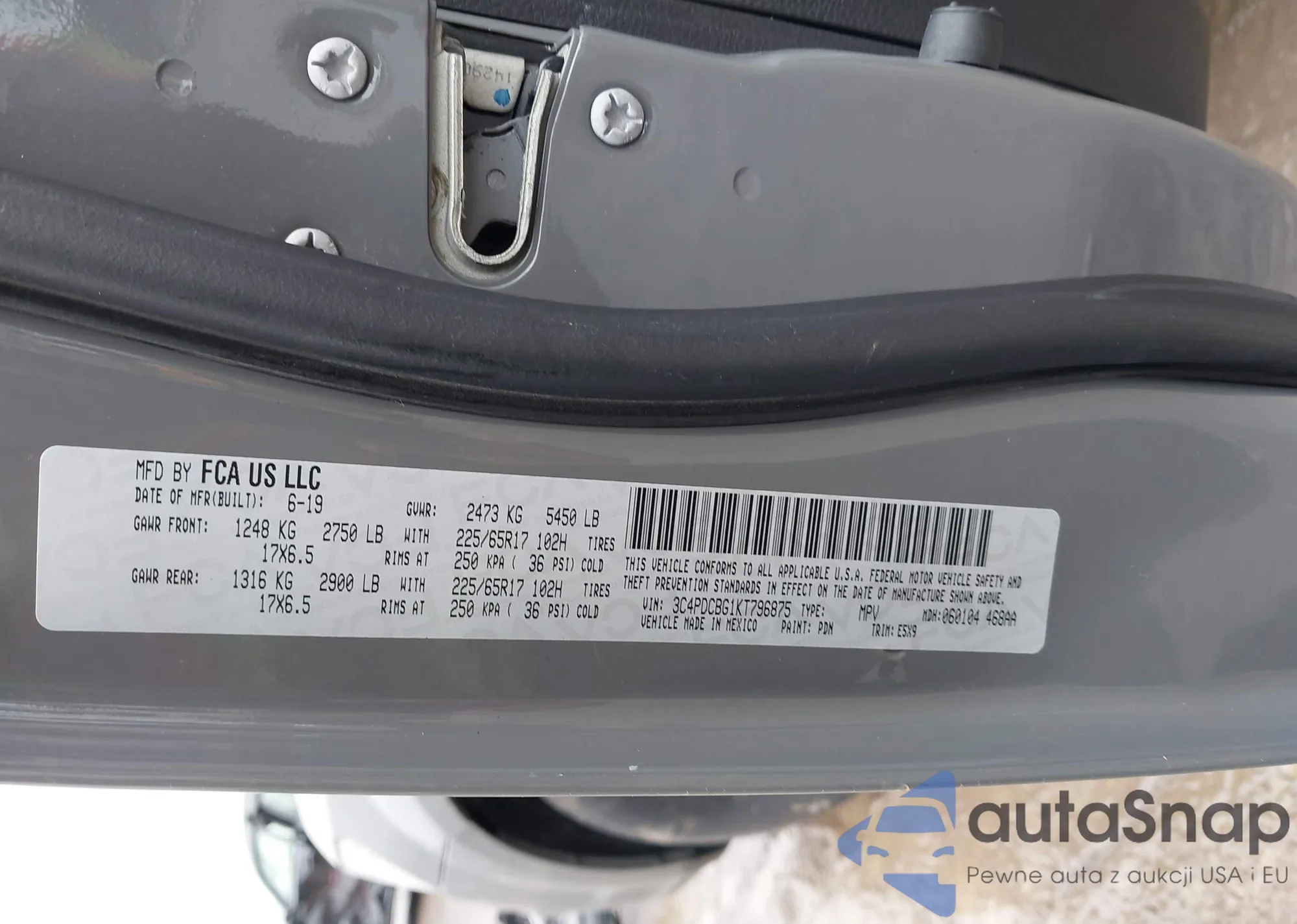 Samochód Dodge Journey 2019 (VIN 3C4PDCBG1KT796875) nie był wcześniej licytowany. Dokumenty są czyste, przebieg odpowiada lub jest niższy niż średnia rynku. Sprzedaje go firma ubezpieczeniowa – polecamy zakup. Dostawa do portu zajmie ok. 6–8 tygodni.