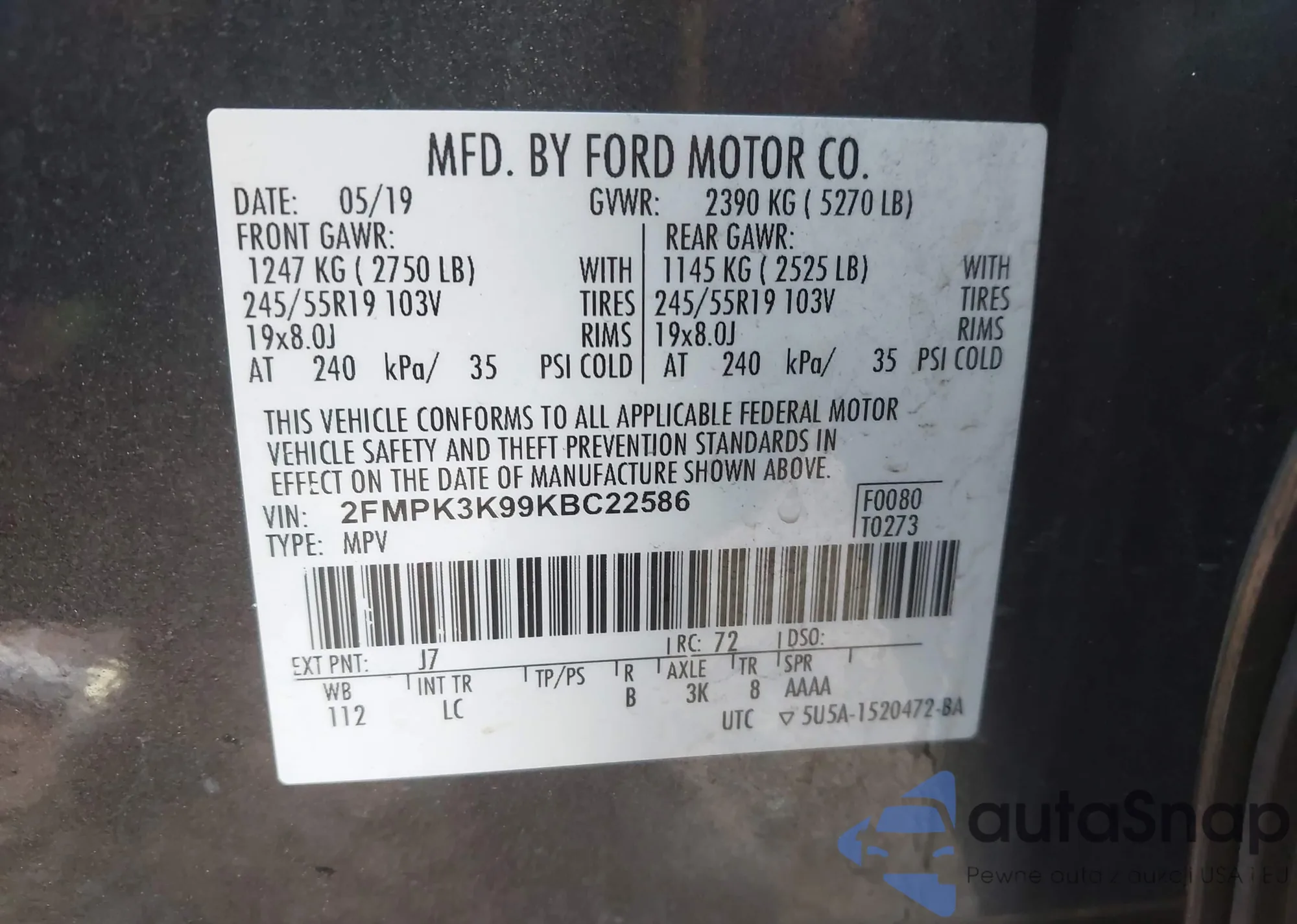 VIN: 2FMPK3K99KBC22586