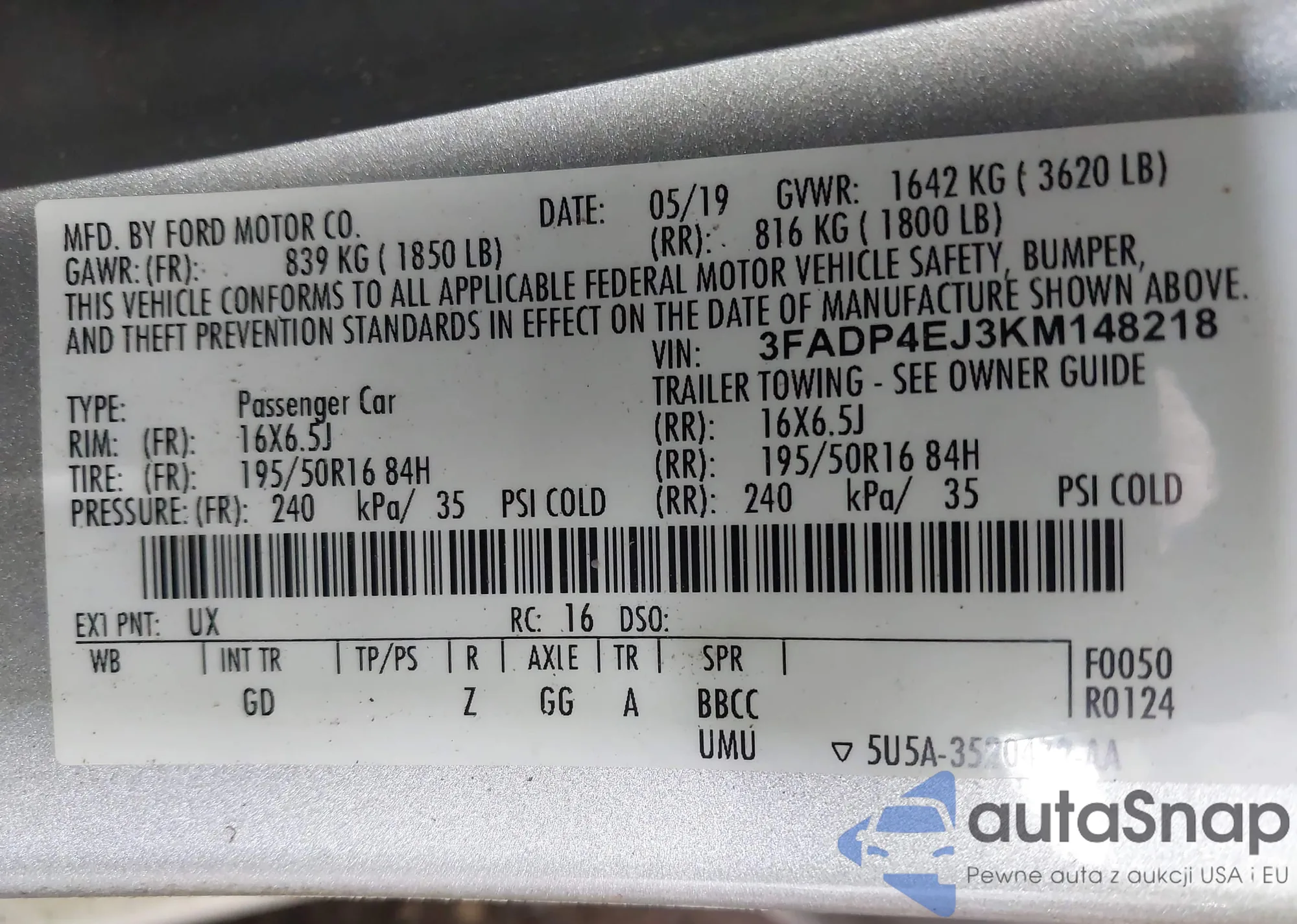 VIN: 3FADP4EJ3KM148218