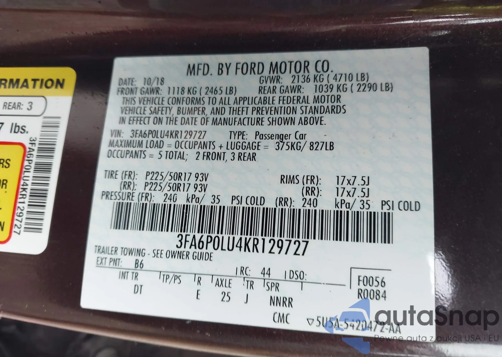 Samochód Ford Fusion 2019 (VIN 3FA6P0LU4KR129727) nie był wcześniej licytowany. Dokumenty są czyste, przebieg odpowiada lub jest niższy niż średnia rynku. Sprzedaje go firma ubezpieczeniowa – polecamy zakup. Dostawa do portu zajmie ok. 6–8 tygodni.