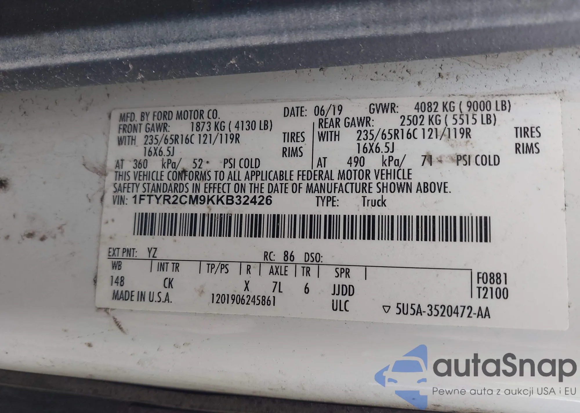 Samochód Ford Transit 2019 (VIN 1FTYR2CM9KKB32426) nie był wcześniej licytowany. Dokumenty są czyste, przebieg odpowiada lub jest niższy niż średnia rynku. Sprzedaje go firma ubezpieczeniowa – polecamy zakup. Dostawa do portu zajmie ok. 6–8 tygodni.